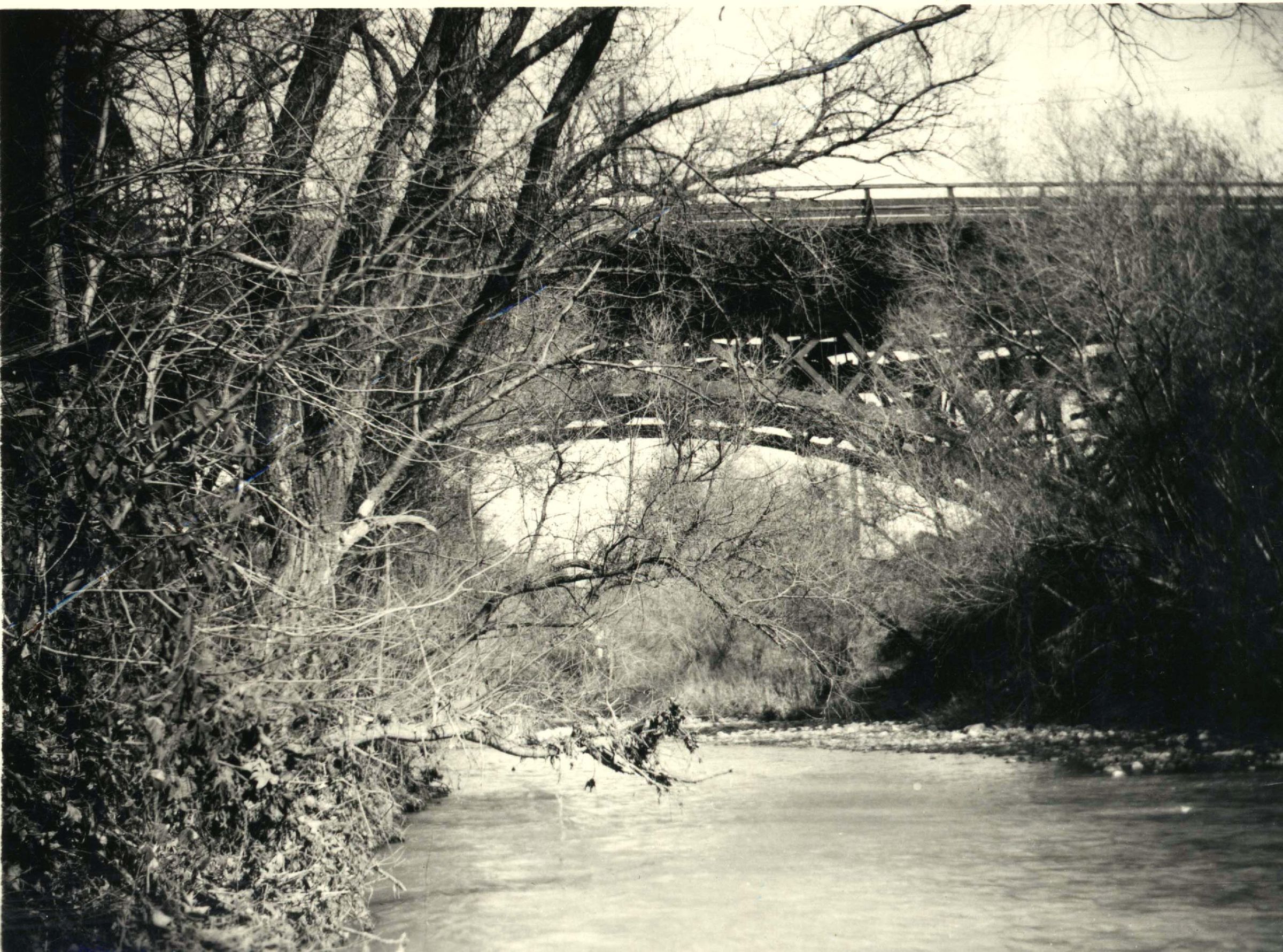 This wooden bridge was built in 1882 and repaired several times before being replaced by a stone and concrete bridge in 1906. This was also known as "Hangman's Bridge" for an event that took place June 17, 1883 when a group of local vigilantes hanged a Californio named Incarnacion Garcia. BRG004Collection