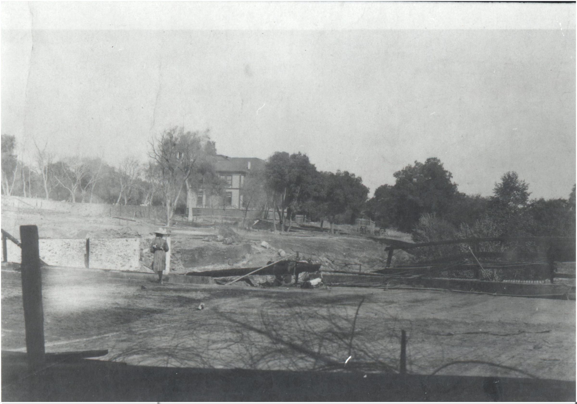 This photograph was taken after the fire of 1901 severely damaged up to 60 buildings west of the bridge. In this view, a girl is standing on the bridge and looking north to the school house. BRG006Collection
