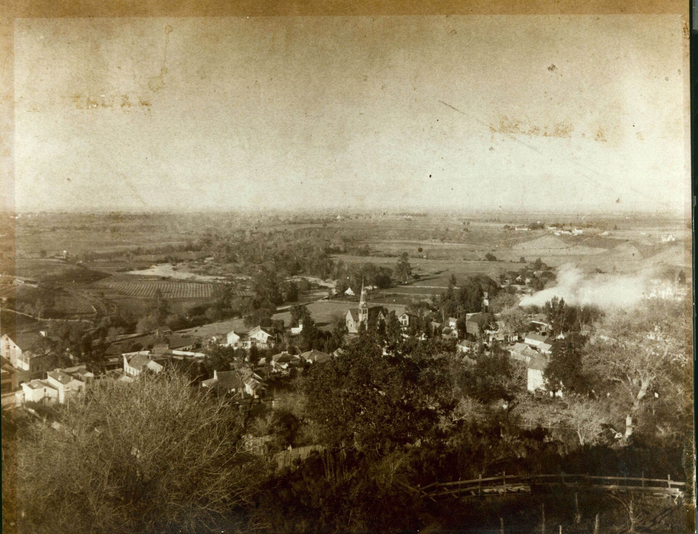 Photograph was taken from College Avenue when the business district was on East Main Street. Forbes Mill is to the extreme left. The Presbyterian Church (1885) is in the center of the photograph, on Church Street. A065Collection