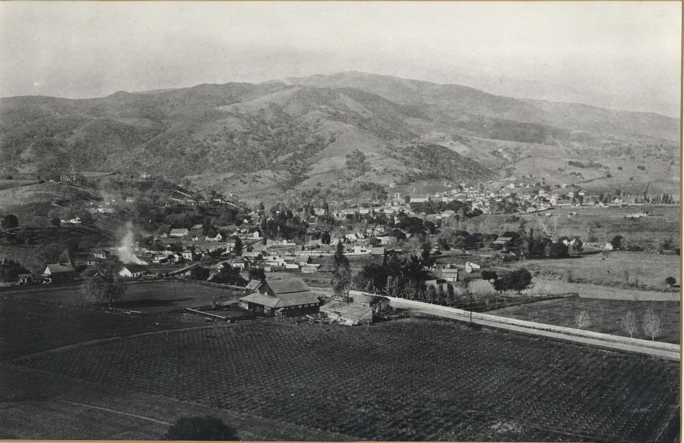 This photo was taken at a point east of Los Gatos on Loma Alta Avenue, formerly called Market Street. The view is westward toward Mount El Sereno with Los Gatos in the foreground. Los Gatos Boulevard, formerly called San Jose Avenue, appears diagonally in the lower right of the picture. HC008Collection