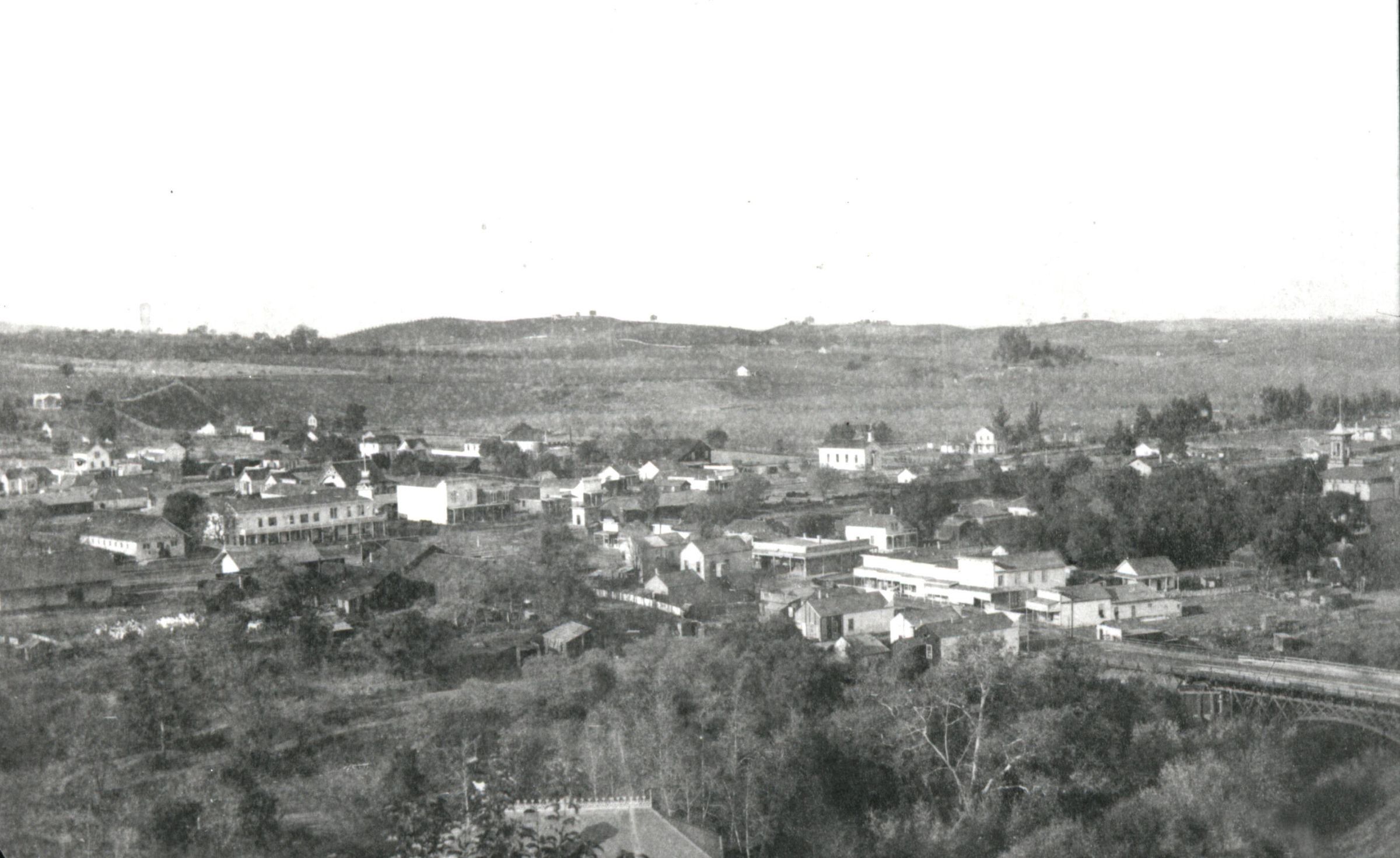 This photograph was taken from high above College Ave. It is a view toward the north and west. The old wooden Main Street Bridge over Los Gatos Creek is in the right foreground. The towered building, far right, is the 1886 elementary school building. The 1881 Catholic Church, just right of center, stood on the southwest corner of North Santa Cruz Avenue and Bean Avenue. HC010Collection