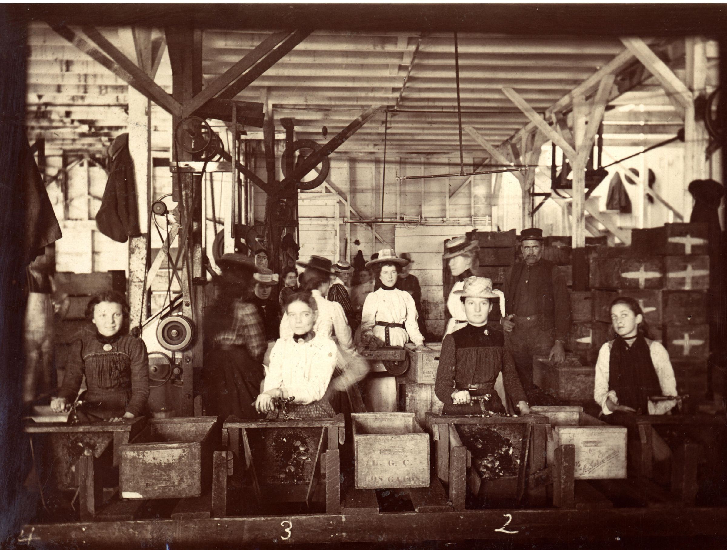 Workers pitting clingstone peaches. An editorial in the Los Gatos Weekly News on Aug. 15, 1890, describes cannery labor as white women, boys and girls, "that which is not in demand in other business." AG013Collection