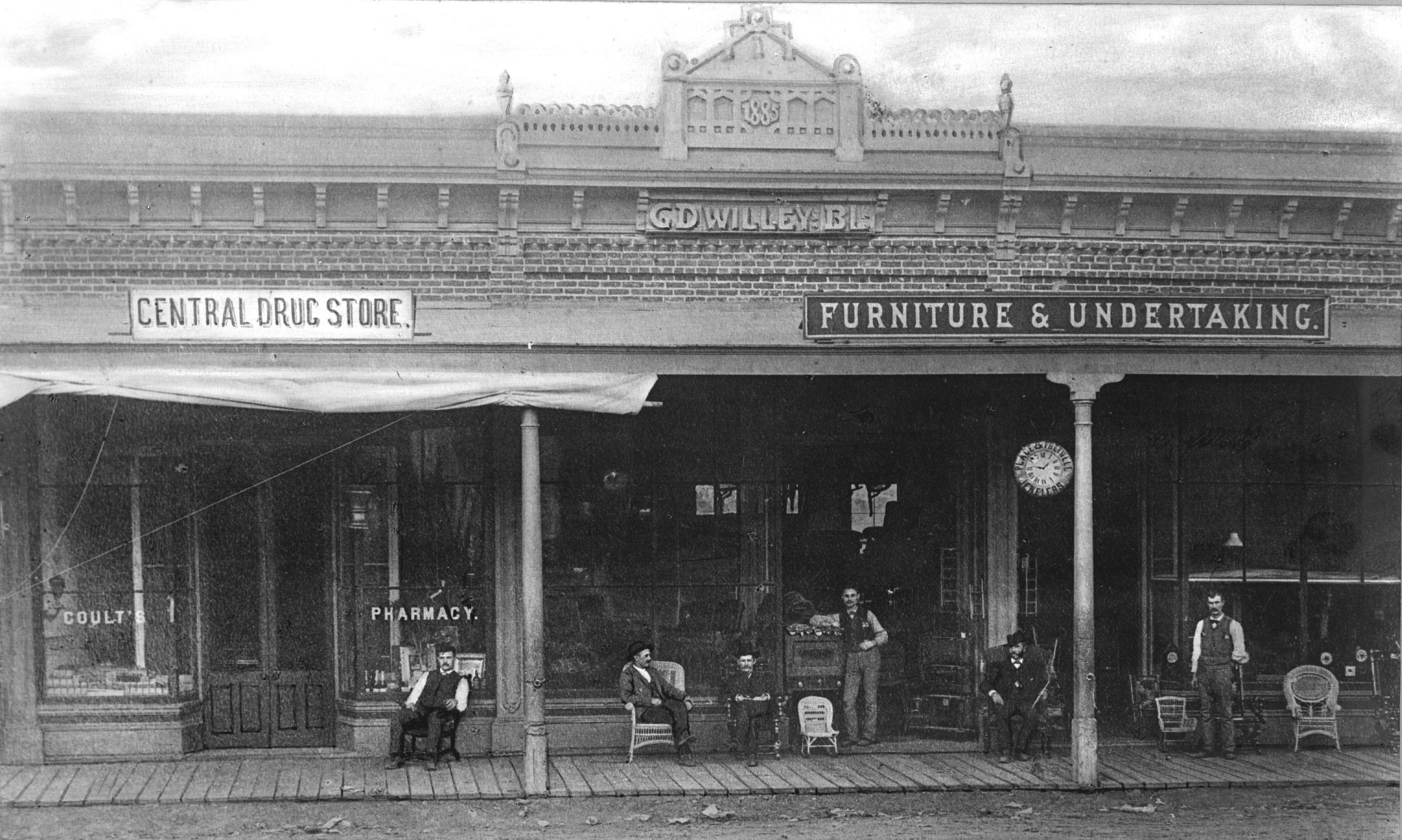 J.H. Coult's Central Drug Store and Place's Furniture Store and Undertaking establishment on the north side of East Main Street. Buildings were destroyed by fire July 26, 1891. HC055Collection