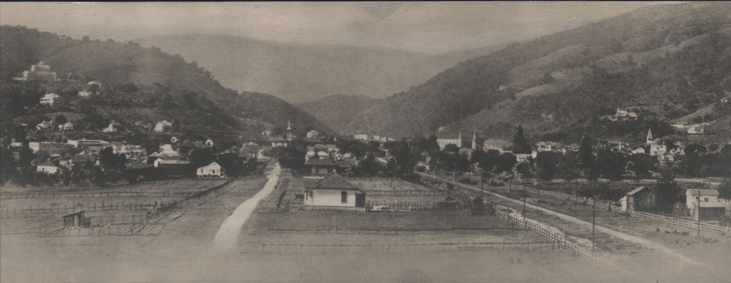 View is looking south on University Avenue. The Los Gatos Central School tower (now the area of Old Town) is visible to the left of center. The Novitiate (1888) is visible in the upper left corner. Electric light poles are seen along the railroad tracks to the right. A033Collection