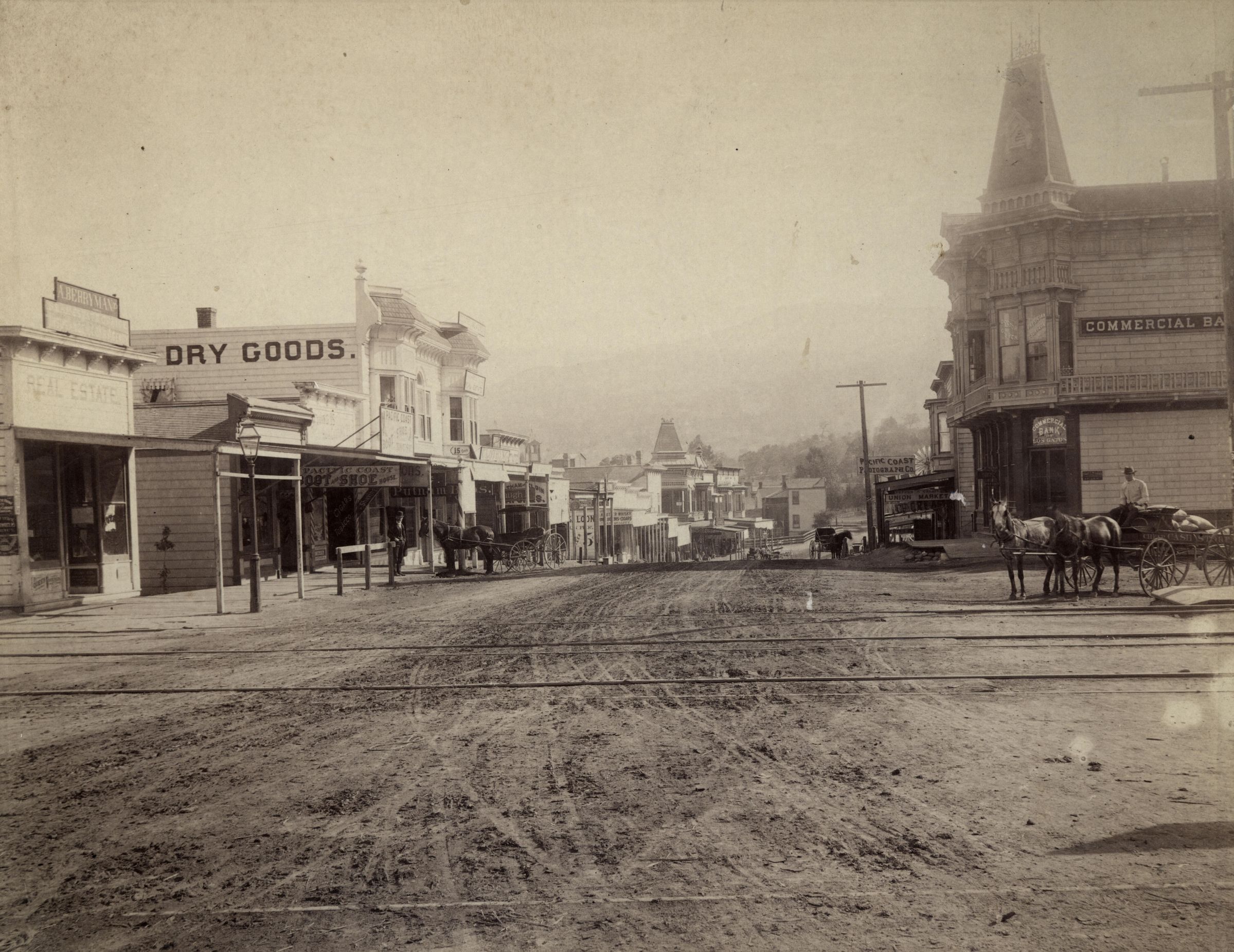 Main street looking east. William Hudson was probably the proprietor of the Dry Goods Emporium on the left. The building on the right with the square tower is the Wilcox building which housed the Commercial Bank. SS038Collection
