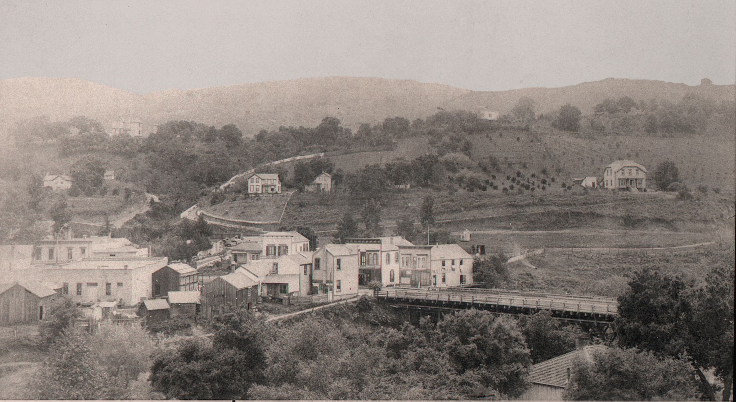 This view of the old wooden bridge is looking in a southeasterly direction, and shows the buildings on East Main Street circa 1890. College Avenue, winding up to the Novitiate, can be seen at left. The Jesuit Order purchased the Harvey Wilcox ranch in 1886, and the Novitiate's main building opened July 25, 1888. BRG015Collection