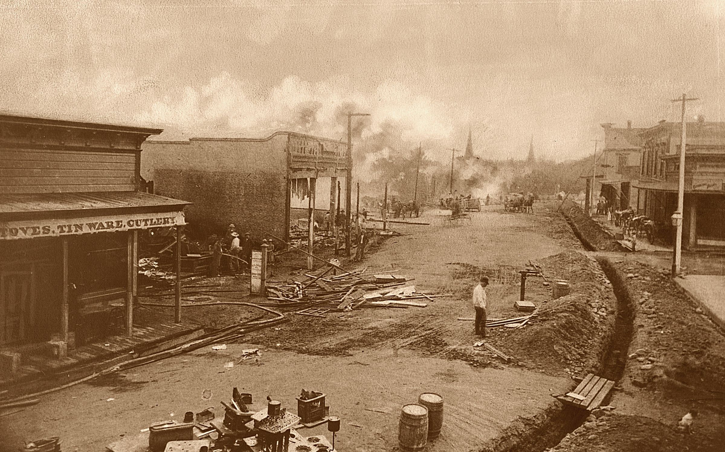 The fire started on the evening of July 26, 1891, in the Place and Fretwell furniture store on the north side of East Main Street, consumed the Arlington Hotel and spread to Richardson Hardware store causing cartridges to explode. Gunpowder stored in a tunnel in the hillside scattered debris in all directions. DIS001Collection