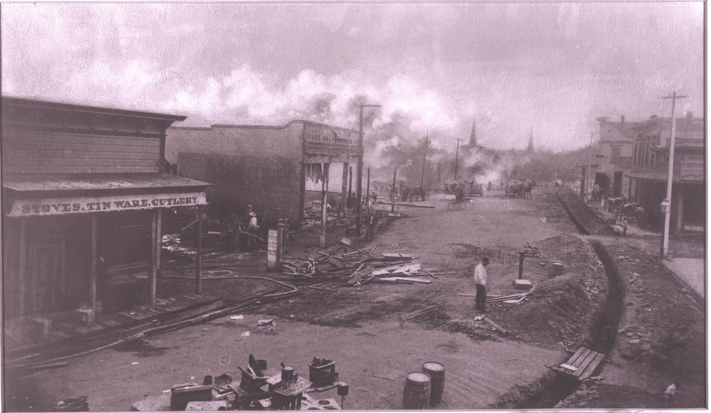 The "Cartridge Fire" of July 26, 1891 started on a Sunday evening in the wooden finishing rooms at the rear of the Place and Fretwell Furniture Store on the north side of East Main Street. The fire destroyed buildings on both sides of Main Street, including the Arlington Hotel, where the tower and turrets collapsed within an hour. Cartridges exploded in the H. J. Richardson Hardware Store, and gun powder stored in a tunnel in the side of a hill scattered earth and stone in every direction. The steeples of the Presbyterian and Methodist churches are seen in the distance. HC058Collection