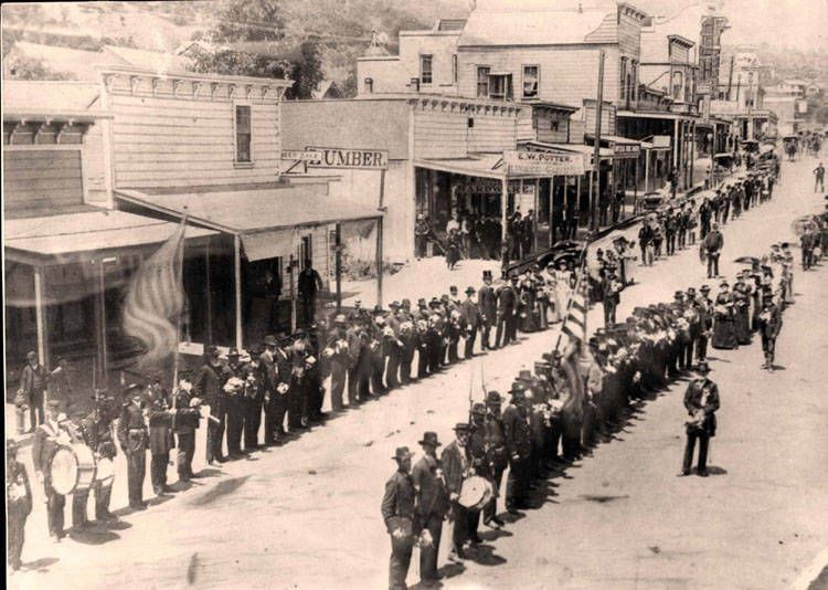 Memorial Day 1891. This view is on East Main Street looking west, near the site of the current Civic Center. The 1896 Los Gatos GAR (Grand Army of the Republic) roster lists members' occupations as orchardists, ministers, ranchers, carpenters, merchants, barbers, physicians, bankers, editors, and many "fruit growers." Although some of the men came from California, most came west from many different states after the Civil War. For a number of years, until its membership grew too small, the G.A.R. would lead the Los Gatos Memorial Day parades. PAR025Dimensions