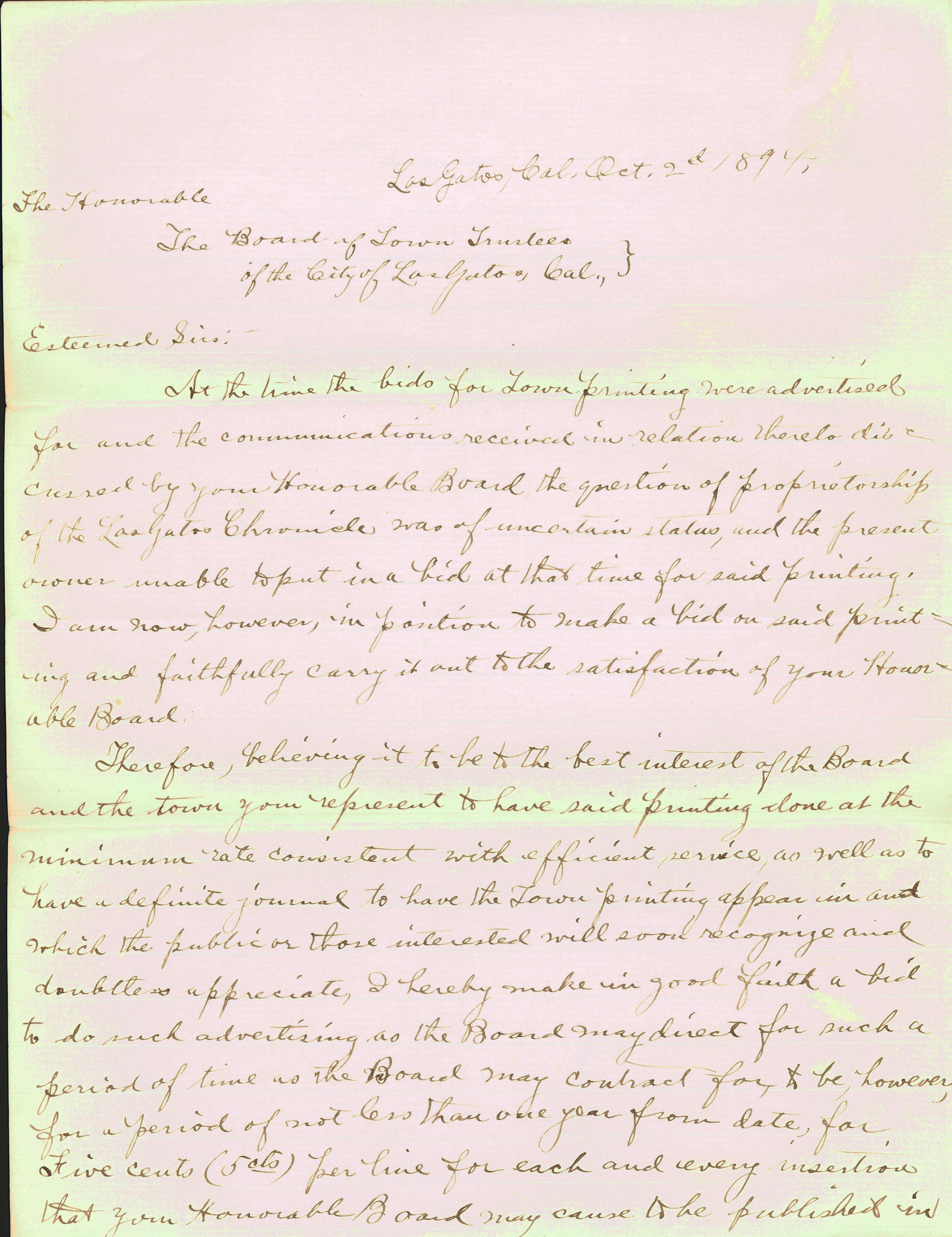 Letter from Leslie Woodruff, Los Gatos Chronicle, seeking to place a bid for printing Town notices. BER182aCollection