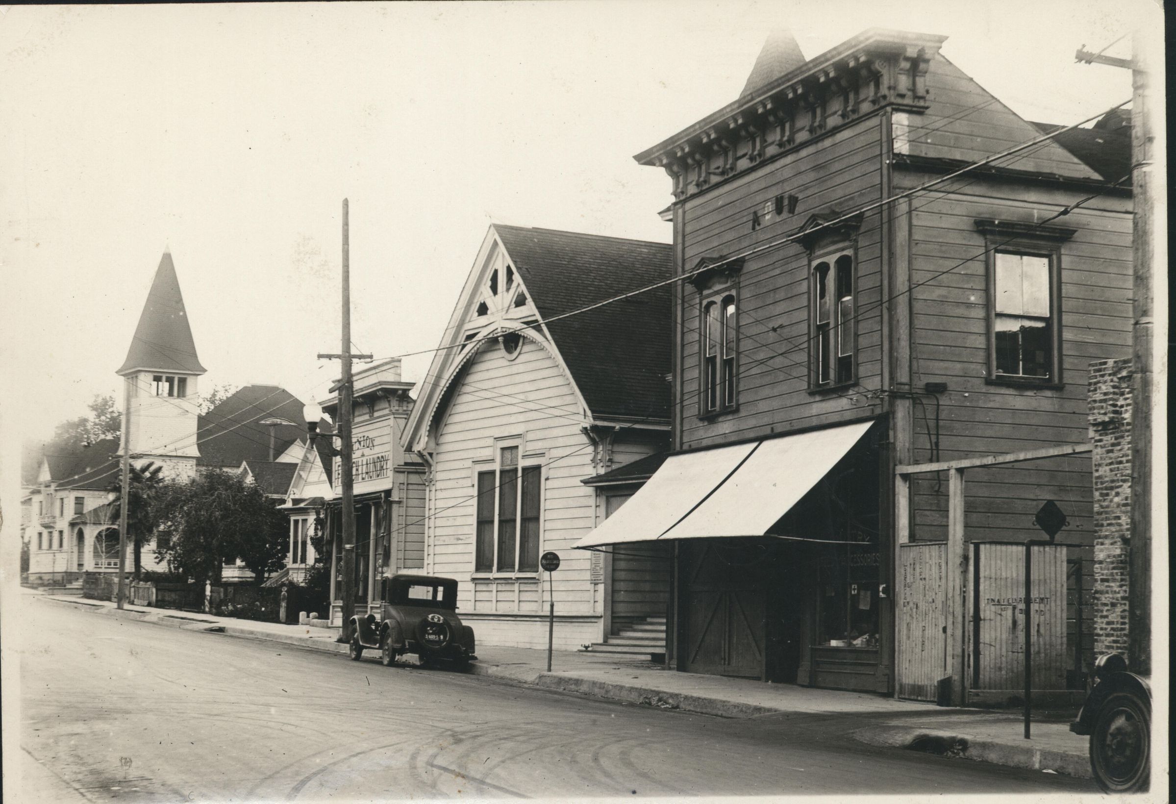 The Christian Church (left) was built in 1884 on the north side of West Main Street (then Hotel Street) just off Santa Cruz Avenue, and in 1930 was moved a block west to a site at the northwest corner of West Main Street and Lyndon Avenue, until it was torn down in 1958. The Ancient Order of United Workmen building (right) was erected in 1881 close to the northwest corner of West Main and Santa Cruz Avenue and moved to this site in January, 1894. Prior to being torn down in 1930 it was used as a Boy Scout hall. HC033Collection