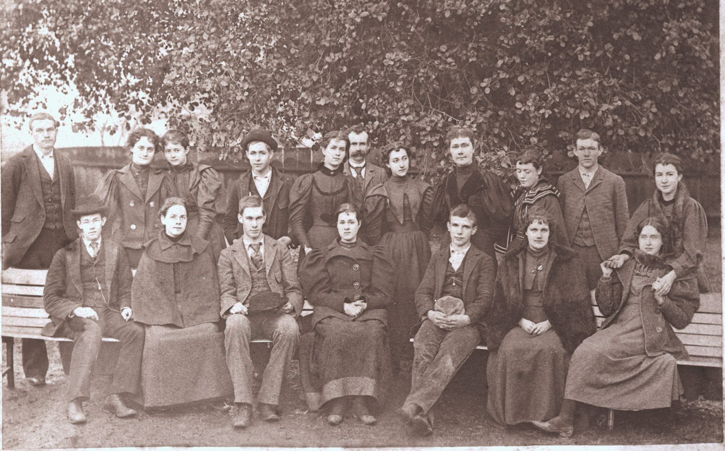 The first high school graduating class in 1896 consisted of ten students who had completed a three-year course. The graduating class of 1897 had completed a four-year course and included many of those pictured here as second year students. Reading left to right: front row - John Crummey, Erma Simons, Edward Waller, Jane Willis, Frank Foster, Myrtle Sporleder, and Jennie Tobin. Back row - Arthur Waller, Harriette Sage, Jennie Mirriam, Nat Symonds, Dora Johnson, Mr. Kelley (teacher), Myrtle Roberts, Miss Martha Cilker (teacher), Ruth Killam, Fred Lobdell, and Amy Irene Milberry. SCH079Collection