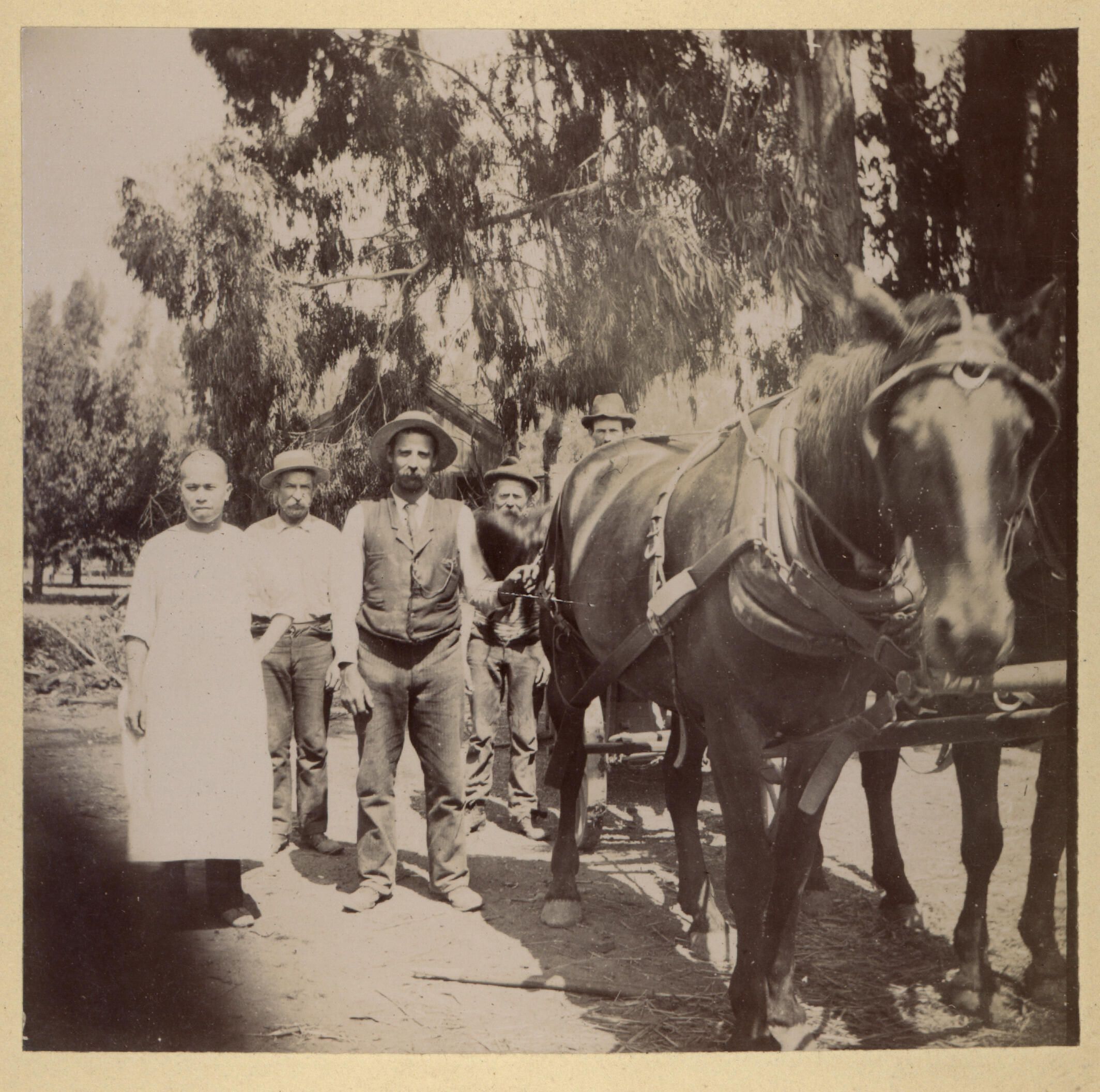 Pictures shows members of a German colony with their Chinese cook. Most of the locomotive workers who built the railroads to connect the Santa Clara Valley with Santa Cruz were Chinese. Many sacrificed their lives while working for the railroads. When creating a tunnel through the Santa Cruz Mountains, there was a natural gas explosion and thirty two men were killed. MTN019Collection