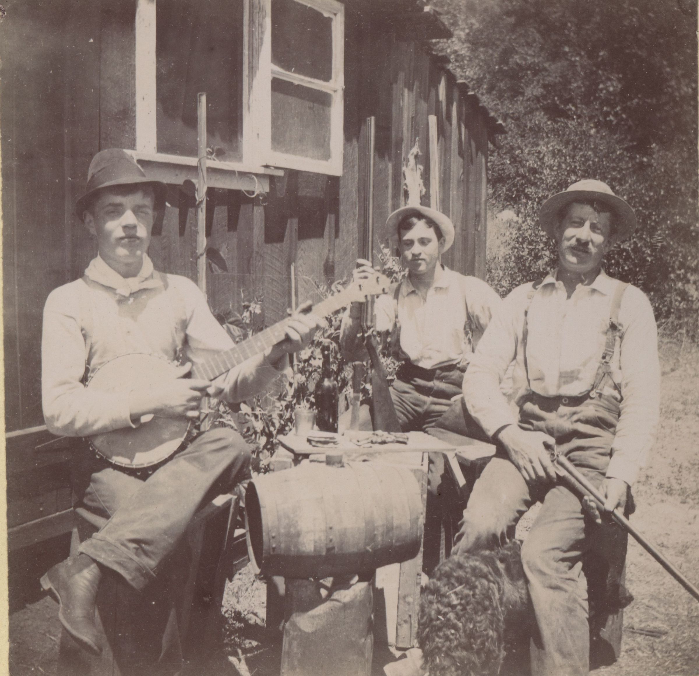 Three men pose for a photograph at Austrian Gulch in 1896. The young man on the left is wearing an Austrian-style hat. MTN006Collection