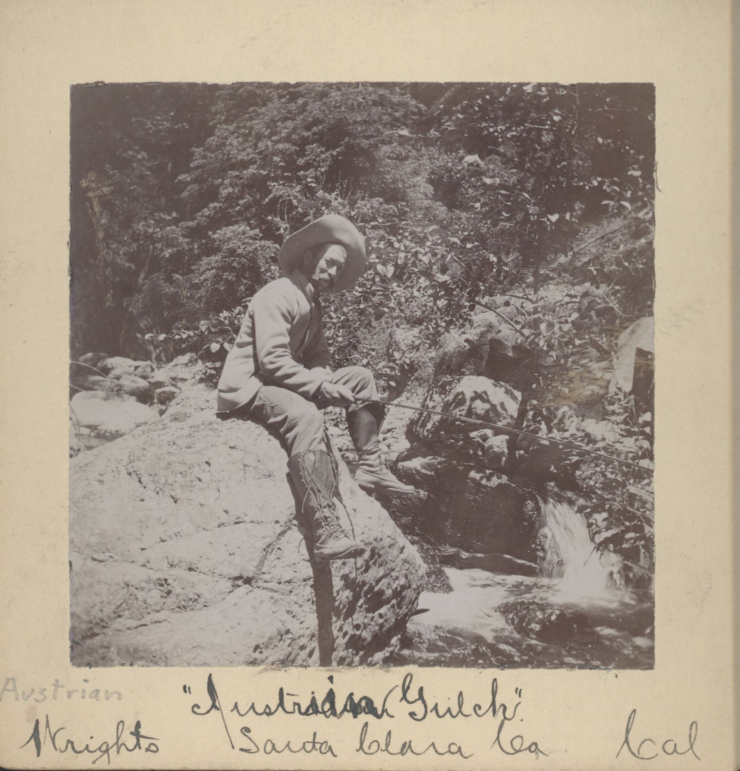 Photograph shows a man sitting on rocks by a creek, fishing pole in hands. MTN014Collection