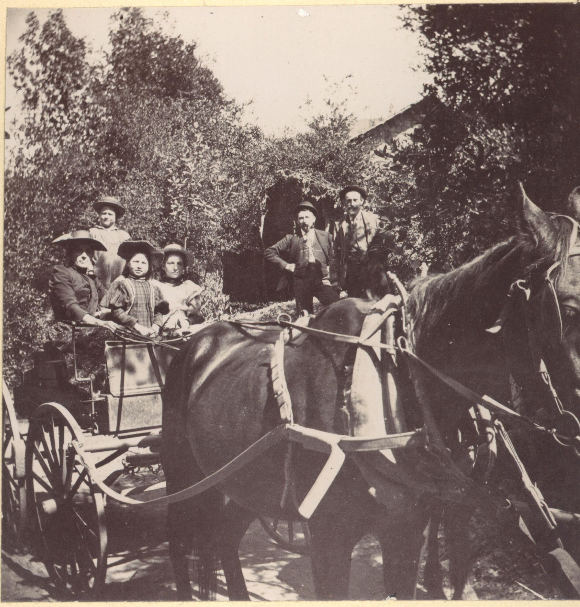 Photo shows a German family dressed up for a ride in their horse drawn buggy. In the background is their home. MTN005Collection