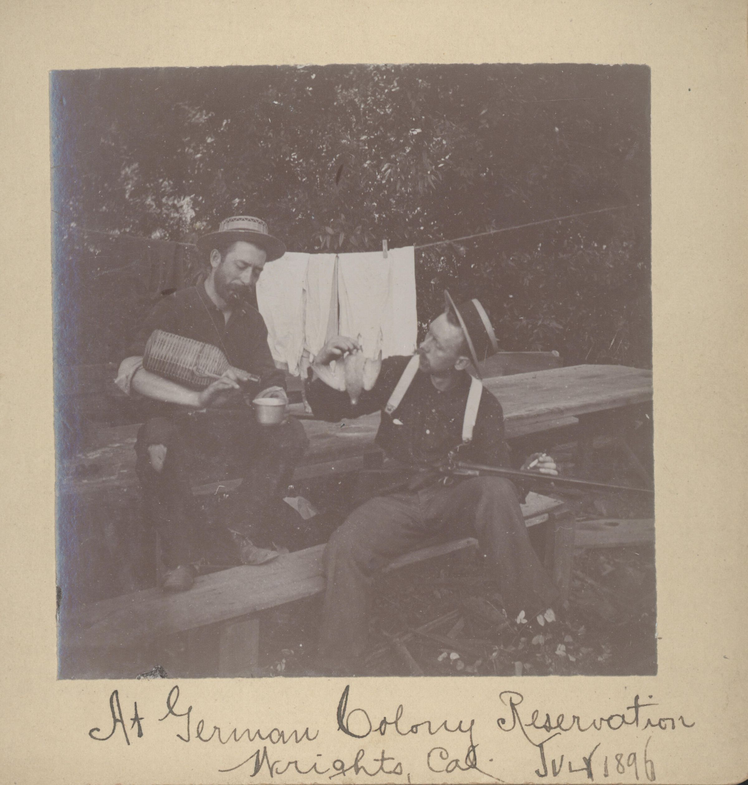 Two men seem to be celebrating a hunt at the German Colony, near Wrights Station. MTN008Collection