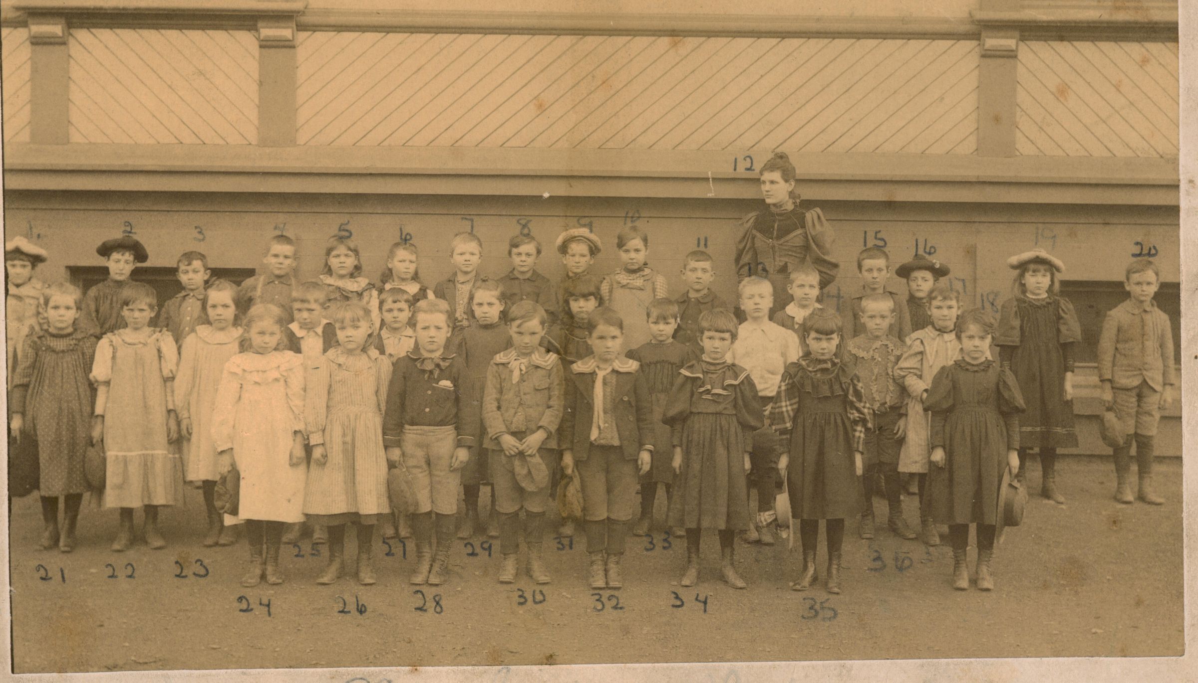 This photograph originally belonged to Leland H. Walker, who is pictured in the second row, #14. Mr. Walker numbered the children, and wrote their names on the back of the photograph. The numbered names are: 1. Ella Olave 2. Irene Hober 3. Paul Crummey 4. Bennie Olave 5. Inez Pope 6. Josie Brown 7. Gus Hensley 8. Ray Shannon 9. Mable Penny 10. Sina Sorenson 11. George Place 12. Miss Van Meter 13. Carl Wren 14. Leland Walker 15. Nathan Clinkinbeard 16. Hoeber 17. Hazel Langford 18. Ehtel Evans 19. Unidentified 20. Frank Bell 21. Unidentified 22. May Brown 23. Bessie Covell 24. Vera Cook 25. Harry Wilder 26. Maggie Eubanks 27. Ray Bookout 28. George Collins 29. Maggie Kelley 30. Hewitt Bond 31. Ethel Blank 32. Stewart Bond 33. 34. Myra Crosby 35. Muriel Killiam 36. Jim Langford. BA035Collection