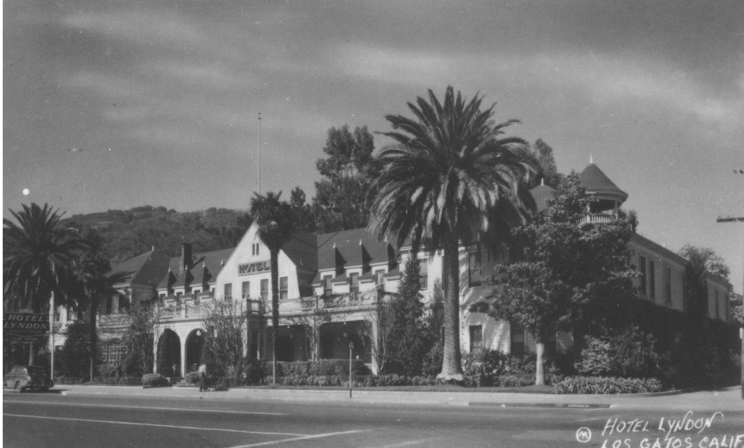 The Hotel Lyndon occupied 175 feet of frontage on Santa Cruz Avenue and for 64 years held an important place in the cultural identity of the town. Many people arrived by train in Los Gatos and remembered spending their first night here. The facility consisted of 60 bedrooms, double dining rooms, and several parlors and sitting rooms. The gentlemen's sitting room, known as the Indian Room, had Navajo hangings and "other Indian bric-a-brac." The ladies' parlor was furnished with easy chairs, paintings, engravings and a piano. There were spacious gardens and cottages to the rear of the main building. The grand opening of the Hotel Lyndon on June 1, 1899 was attended by nearly all of Los Gatos. HOT003Subject