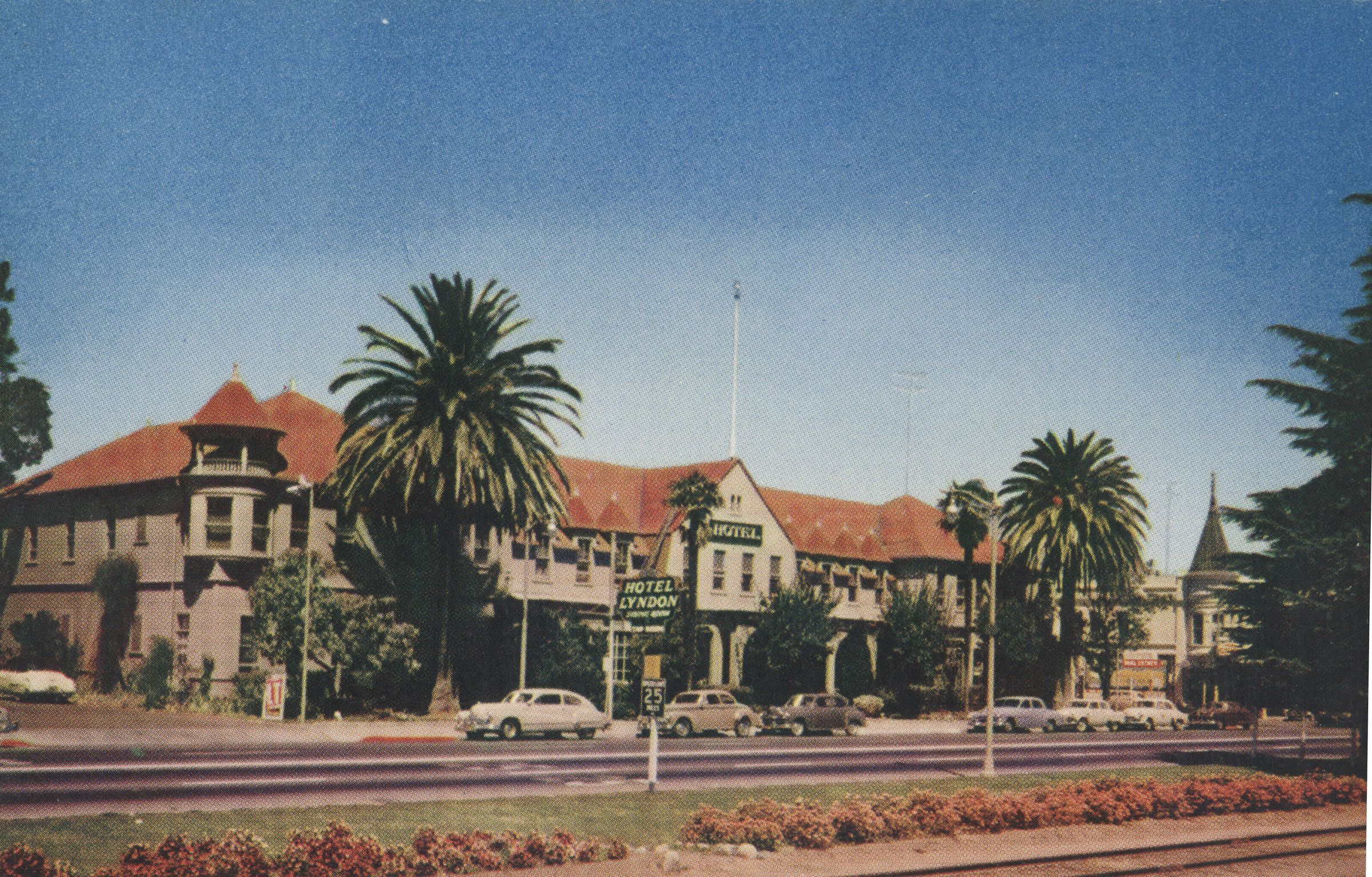 The Hotel Lyndon, pictured here in the mid-1950s, occupied 175 feet of frontage on Santa Cruz Avenue and for 64 years held an important place in the cultural identity of the town. Many people arrived by train in Los Gatos and remembered spending their first night here. The facility consisted of 60 bedrooms, double dining rooms, and several parlors and sitting rooms. Of special note was the gentlemen's sitting room, known as the "Indian Room," with Navajo hangings and "other Indian bric-a-bac." The ladies' parlor was furnished with "restful easy chairs, paintings, engravings and a piano". There were spacious gardens and cottages to the rear of the main building. The grand opening of the Hotel Lyndon on June 1, 1899 was attended by nearly all of Los Gatos. HOT014Subject