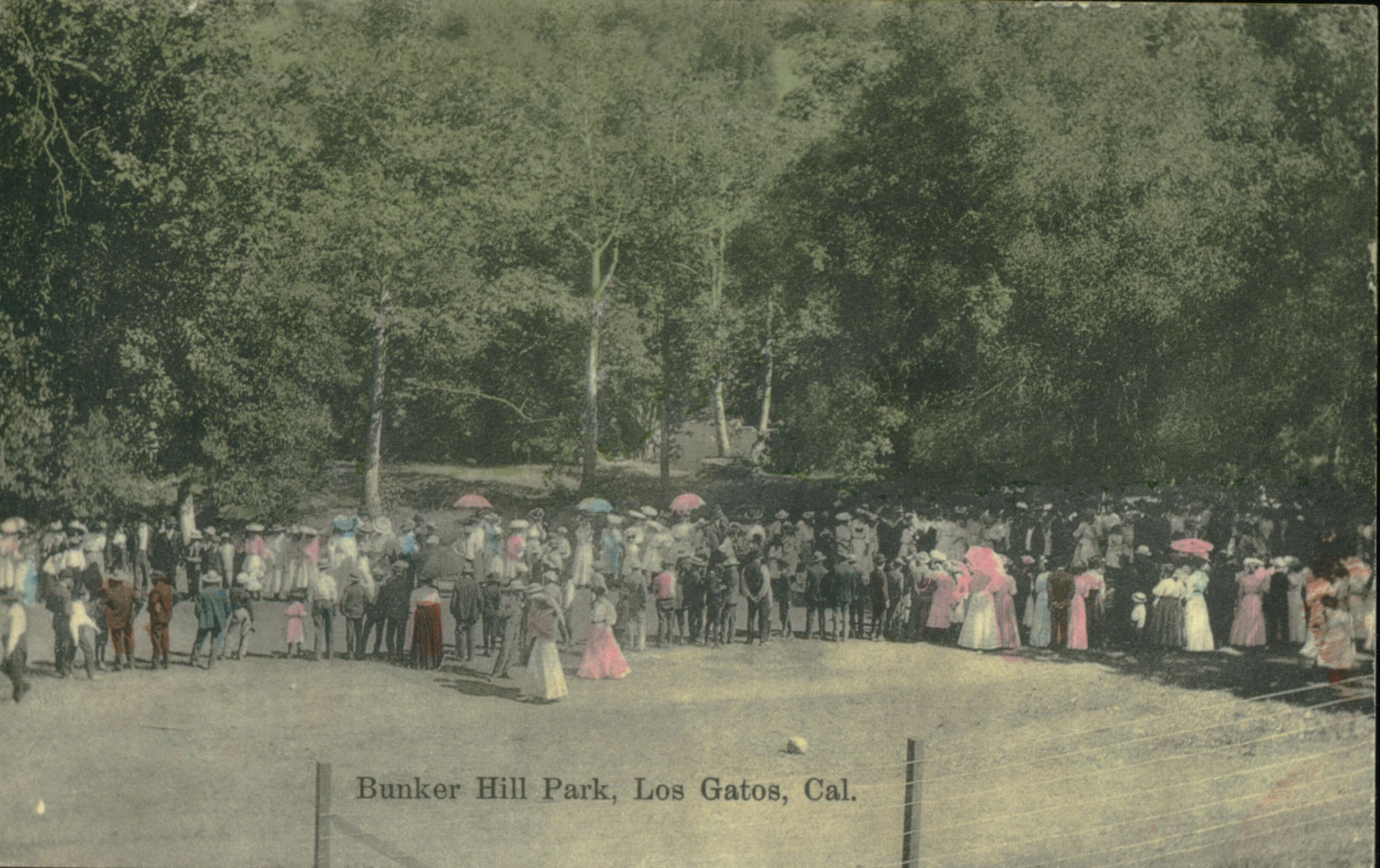 This postcard view shows people gathered in beautiful Bunker Hill Park along Los Gatos Creek at the turn of the 20th century. Large oak and sycamore trees hung their branches over the water, providing shade on hot summer days. This park was sacrificed when Highway 17 was built. LGC013Subject