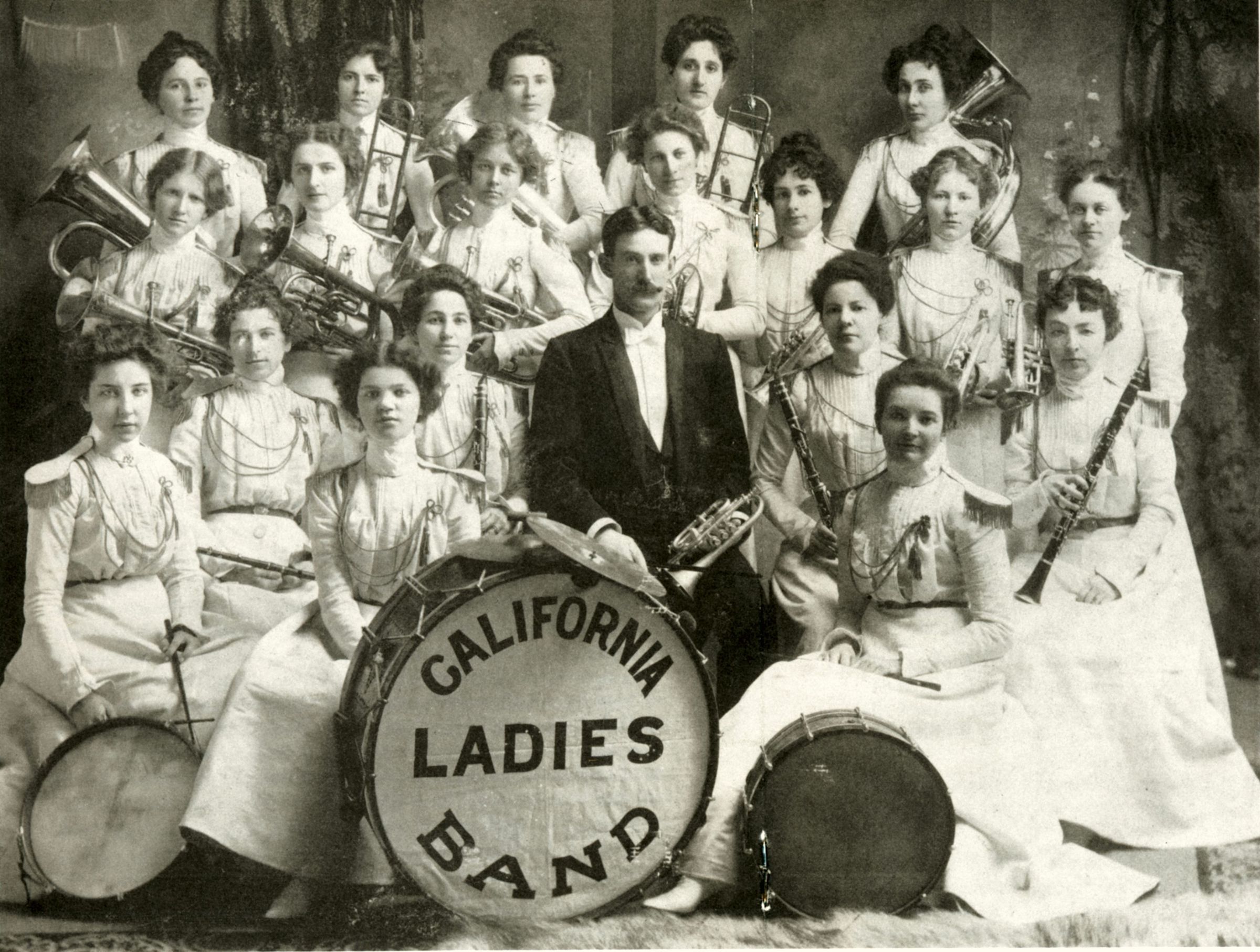 The California Ladies Band was organized by Fred Brohaska in 1898. The all-female band was a novel and daring departure for the time, and included many members from Los Gatos. The band appeared at The Pavilion (at the Los Gatos Cannery) on North Santa Cruz Avenue in 1900, and in 1901 they performed for President McKinley when he visited San Jose. Pictured left to right are (first row) Georgia Saunders, Isabell Huber, Ethel Height; (second row) Laura La Montagne, Julia La Montagne (Mrs. Wm. Cleland), Fred Brohaska, Rachel Rosenberg, and Mrs. Agnes Currier; (third row) Camille Stockton, Edith Huber, Minnie Tupper, Stella Hoard, Delia Macabee, Mrs. Libby Weaver, and Mrs. Clara Holliday; (fourth row) Mrs. Edward Macabee, Mrs. Clarisse Walker, Mary Macabee, Tillie Brohaska, and Flora Macabee. PAR030Collection