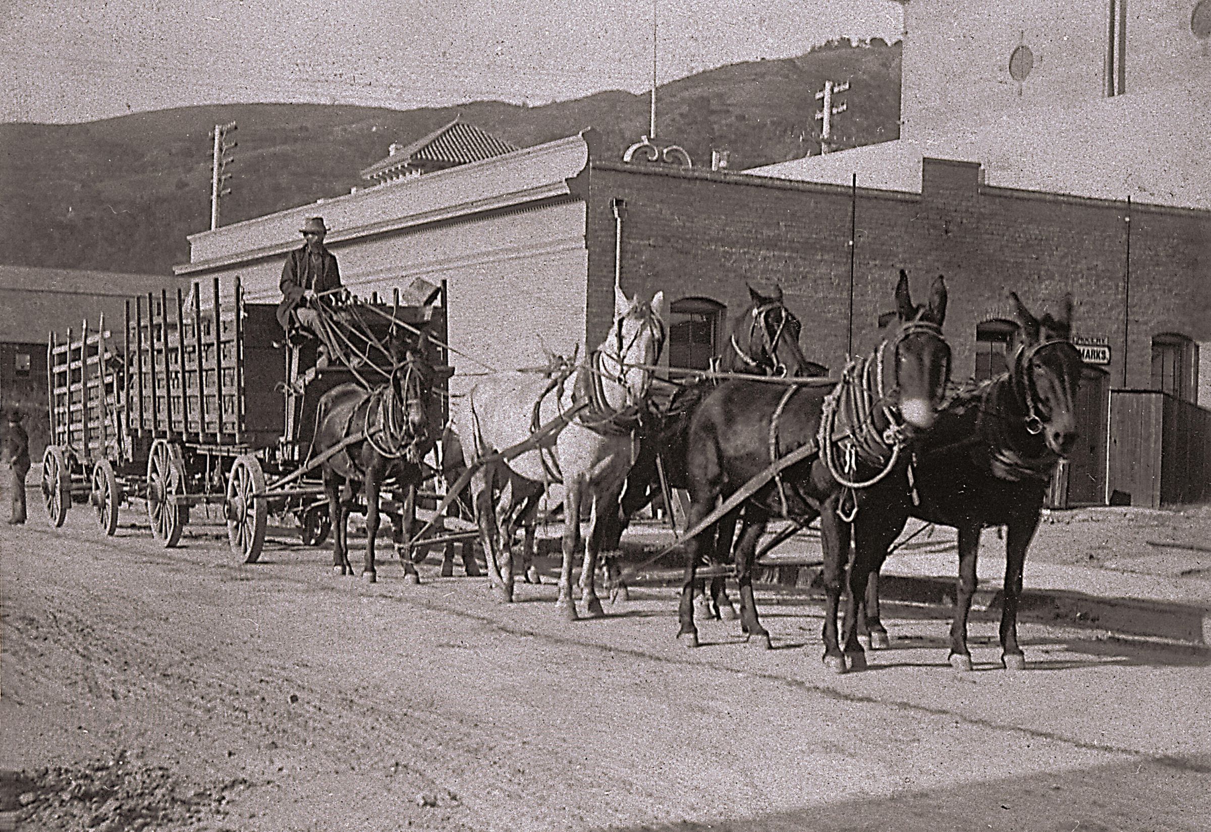 This is how freighted goods were moved about at the turn of the 20th century. The wagon here is led by a team of mules. SS102Collection
