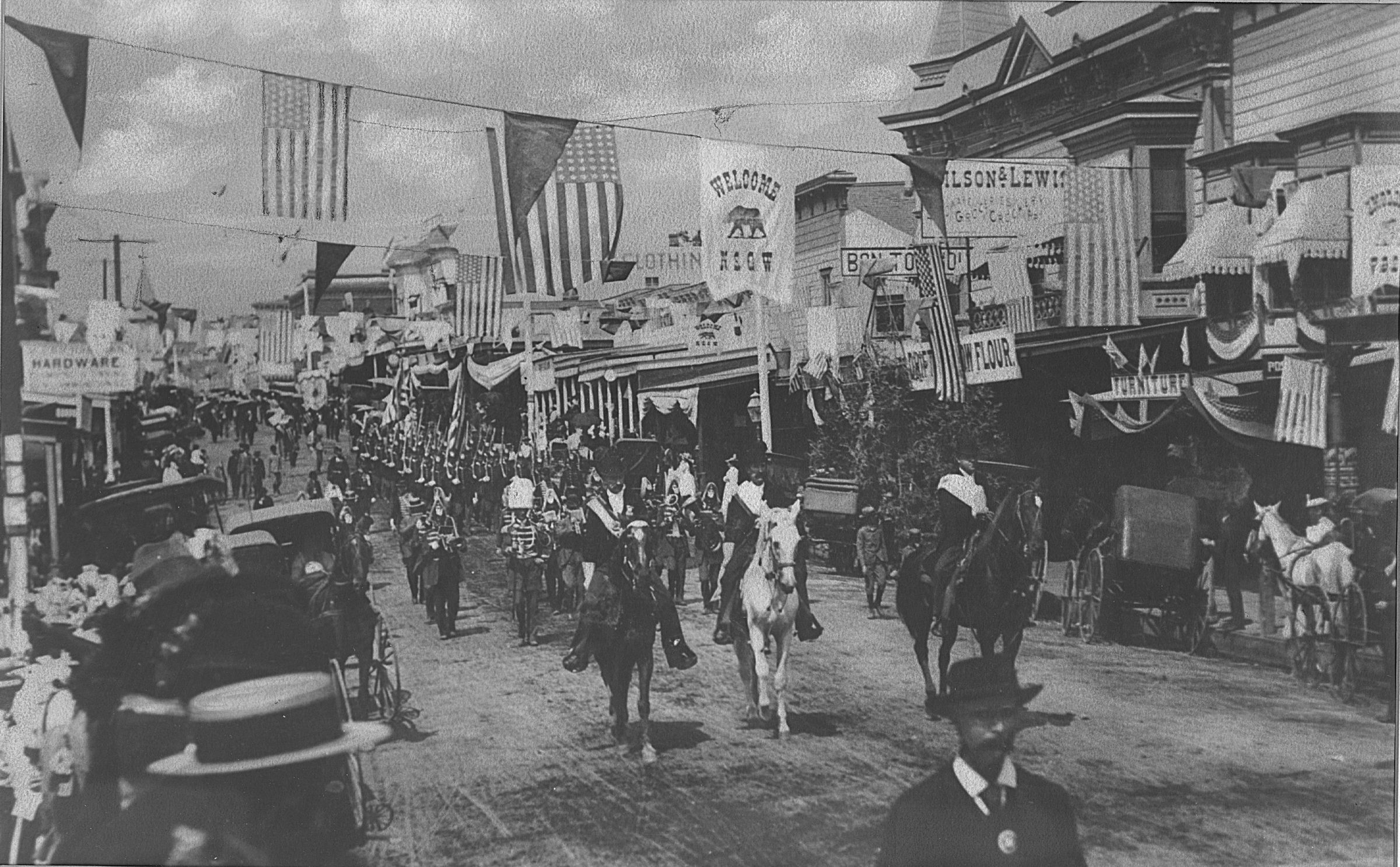 The 1900 Fourth of July parade is shown marching on East Main Street westward toward the bridge and Bunker Hill Park, where the partricipants and other townspeople gathered for lunch, speeches, singing and other entertainments. HC018aCollection