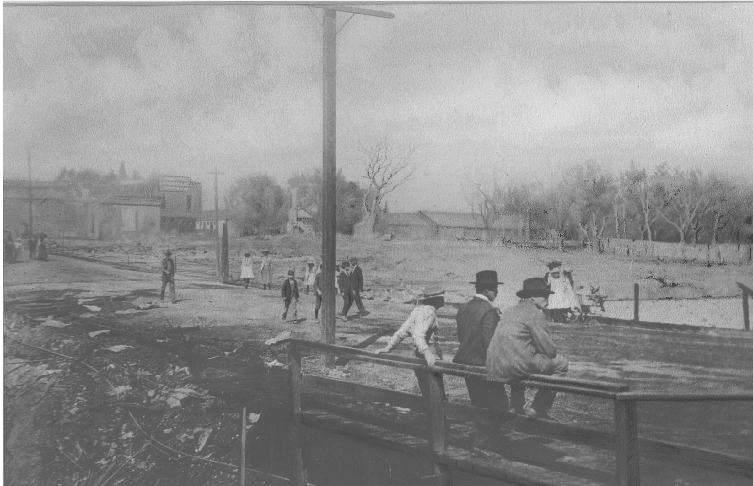 Looking northwest from the Main Street bridge after the Livery Stable Fire of October 13, 1901. The Public Reading Room, far left, was the only building left standing on West Main street. DIS006Collection
