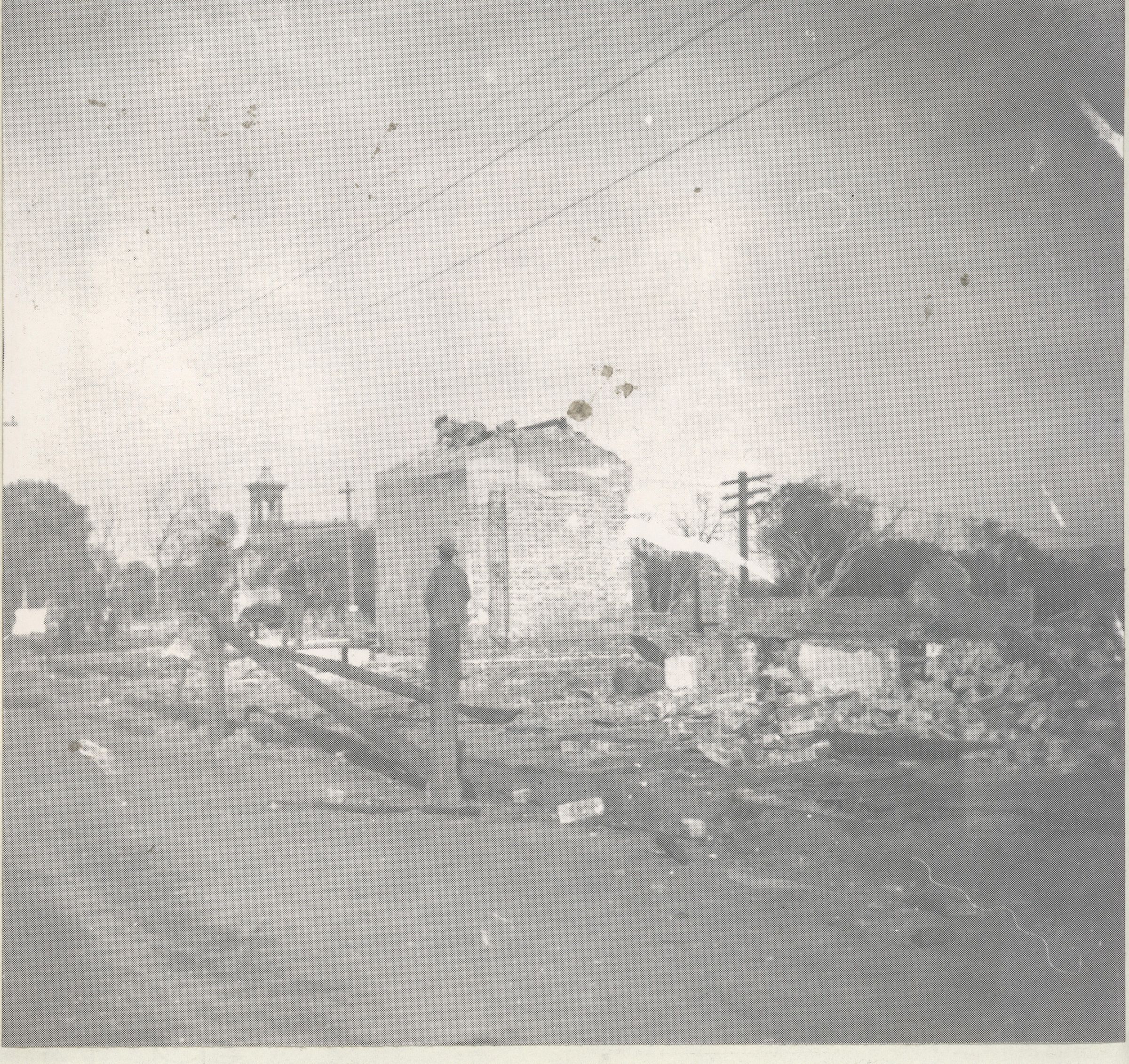 The bank vault of the Commercial Bank, shown at the center of this photograph, had 21-inch thick walls, lined with steel, and withstood the heat of the fire. The bank was an ornate Victorian building situated at the corner of Main and Front Streets (now Montebello Way). The school on University Avenue is in the background. Notice the crumpled wooden sidewalks. DIS009Collection