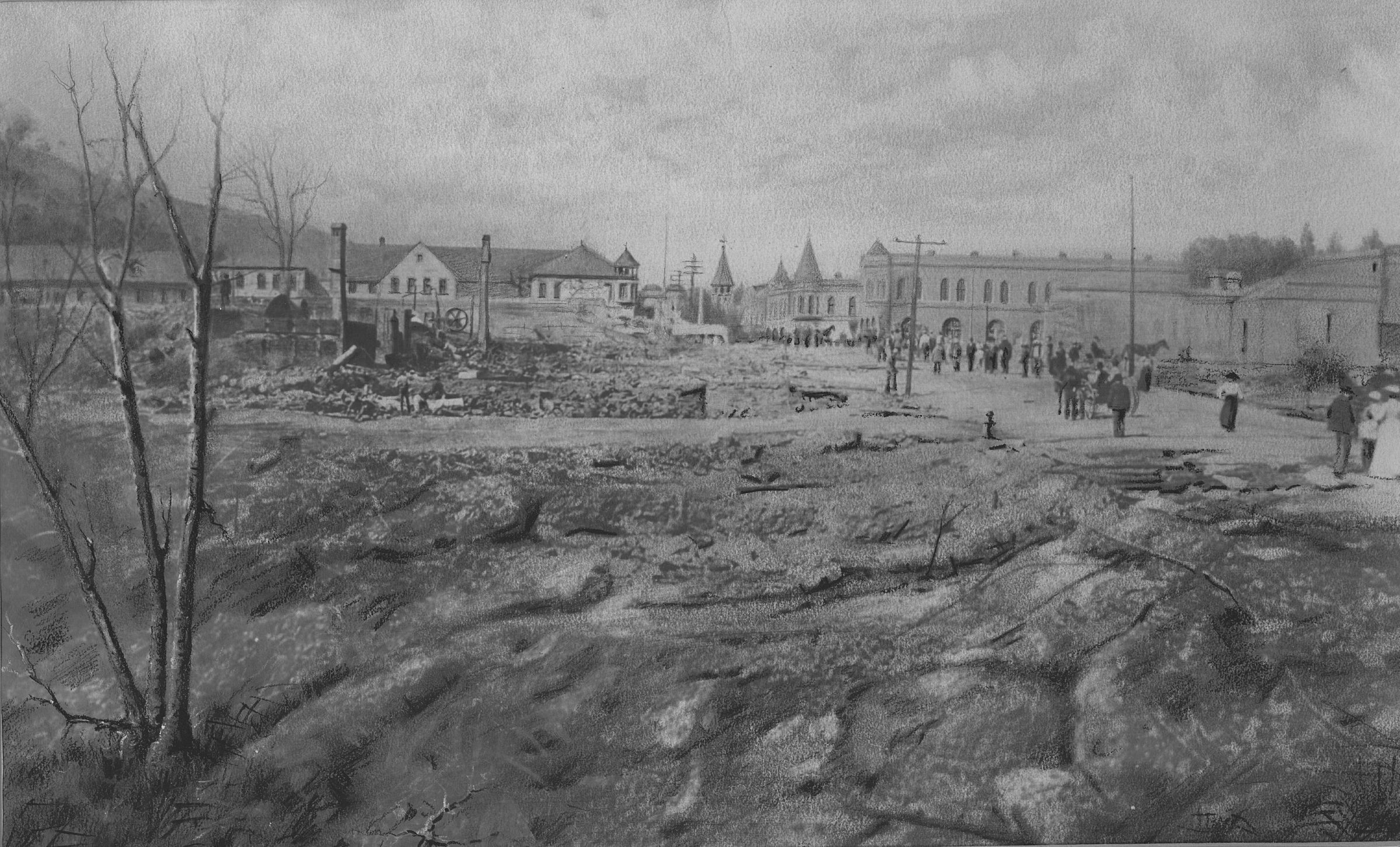 View shows what was left on the south side of West Main Street, looking west from the bridge. The fire stopped at the railroad tracks, saving the Hotel Lyndon. HC082Collection