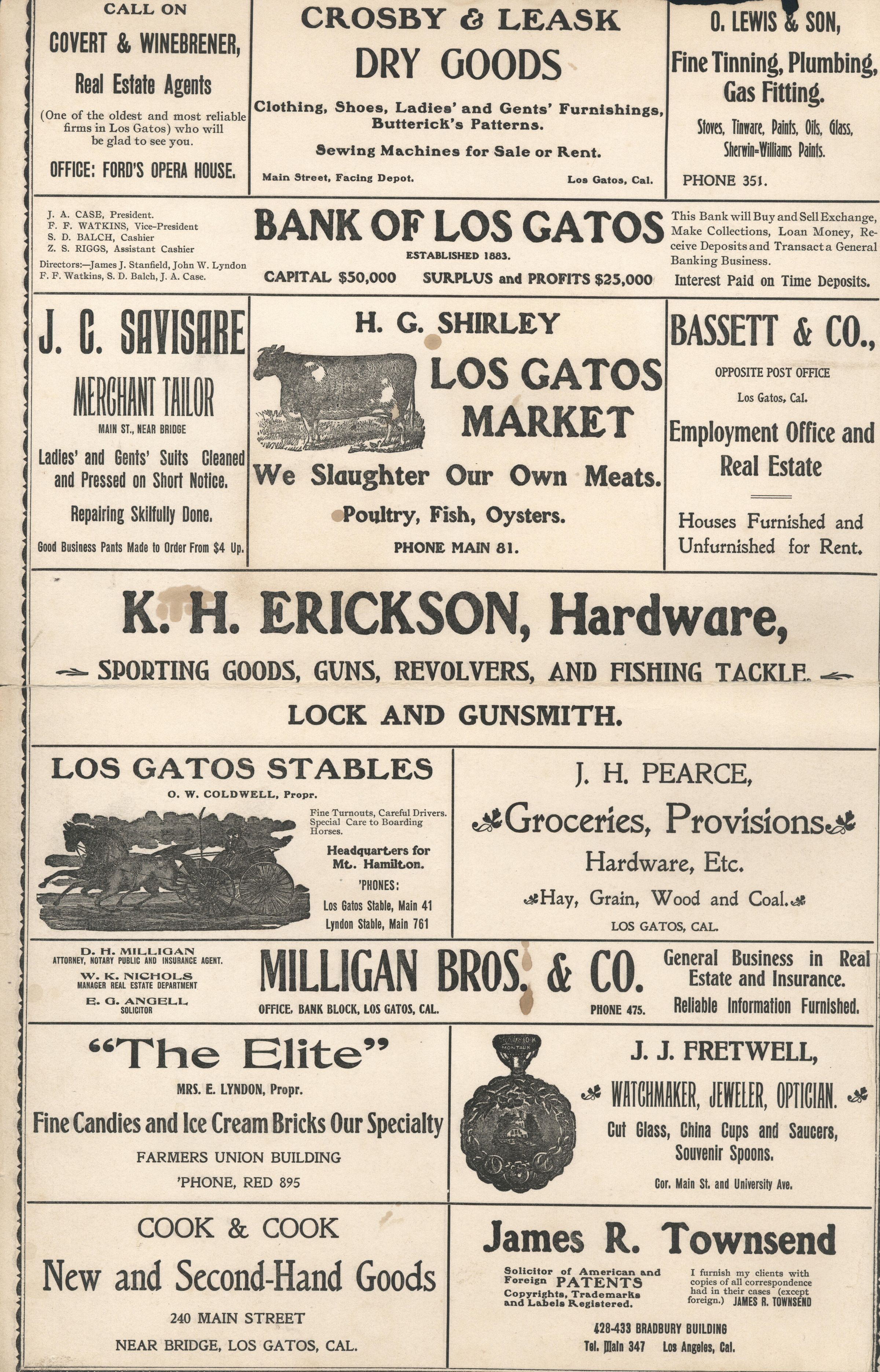 Merchants include: Covert & Winebrener, Real Estate Agents; Crosby & Leask, Dry Goods; O. Lewis & Son, Fine Tinning, Plumbing, Gas Fitting; Bank of Los Gatos; J. C. Savisare, Merchant Tailor; H. G. Shirley, Los Gatos Market; Bassett & Co., Employment Office and Real Estate; K. H. Erickson, Hardware; Los Gatos Stables; J. H. Pearce, Groceries, Provisions; Milligan Bros. & Co., General Business in Real Estate and Insurance; "The Elite" Fine Candies and Ice Cream Bricks Our Specialty; J. J. Fretwell, Watchmaker, Jeweler, Optician; Cook & Cook New and Second-Hand Goods; and James R. Townsend, Solicitor of American and Foreign Patents. BER166Collection