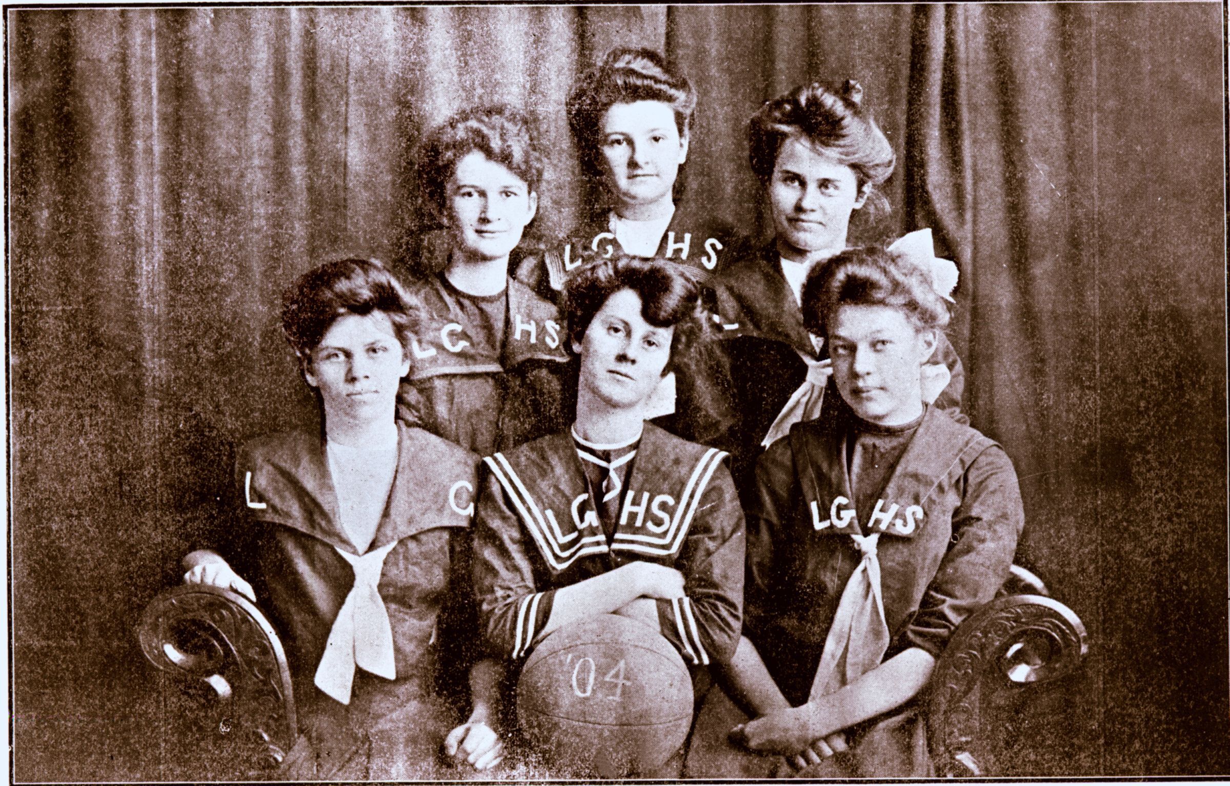 Members of the LGHS women's basketball team in 1904. Front row, left to right: Edith Peacock, goal; Hazel Groom, captain, goal, and Nellie Ford, center. Back row: Myra Crosby, center, Obera Malcom, opposition and Aileen Peacock, opposition. BA199Collection
