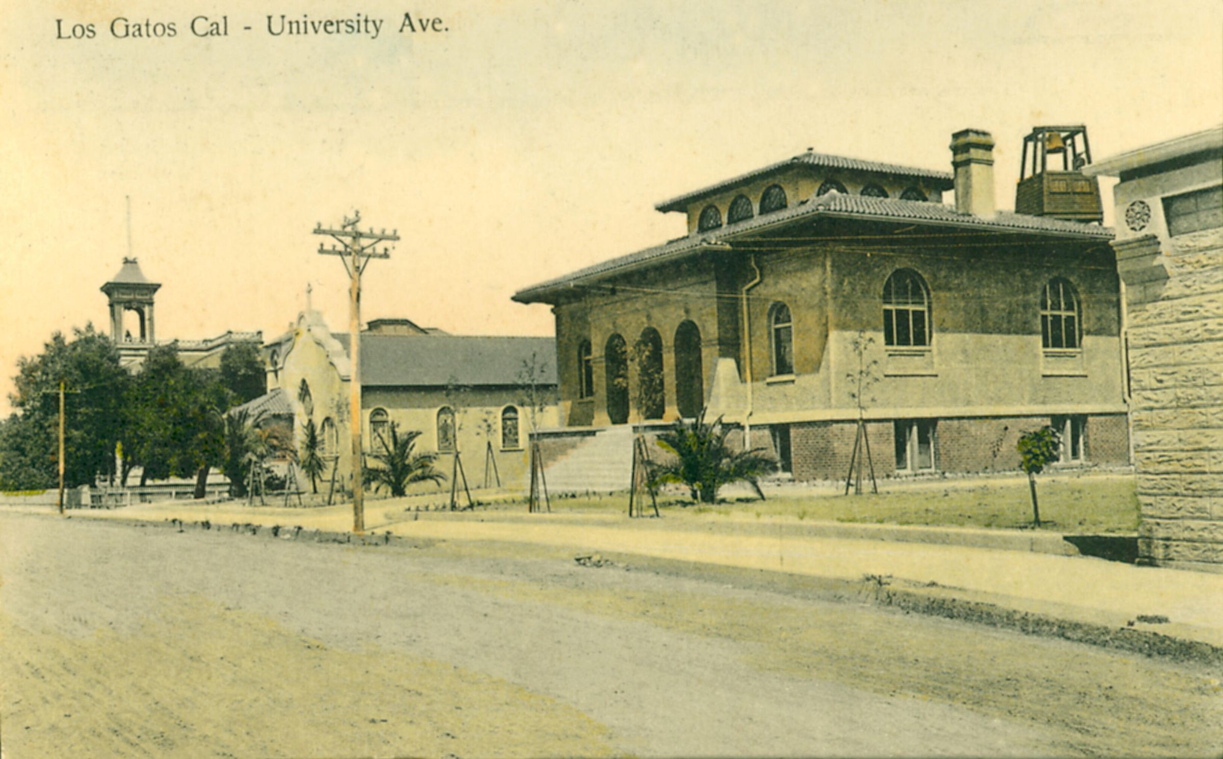 View of the east side of University Avenue. Carnegie Library, St. Luke's Episcopal Church, and tower of the grade school are seen. BER009Subject