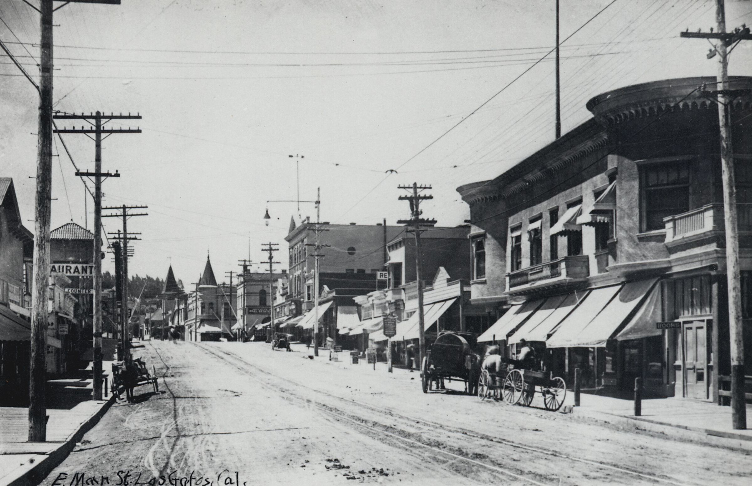 The building on the right with the semi-circular roof lines was the Foothill Hotel in the Montezuma Block. The conical roof of the Hofstra Block (La Canada Building) can be seen in the background. SS003Collection