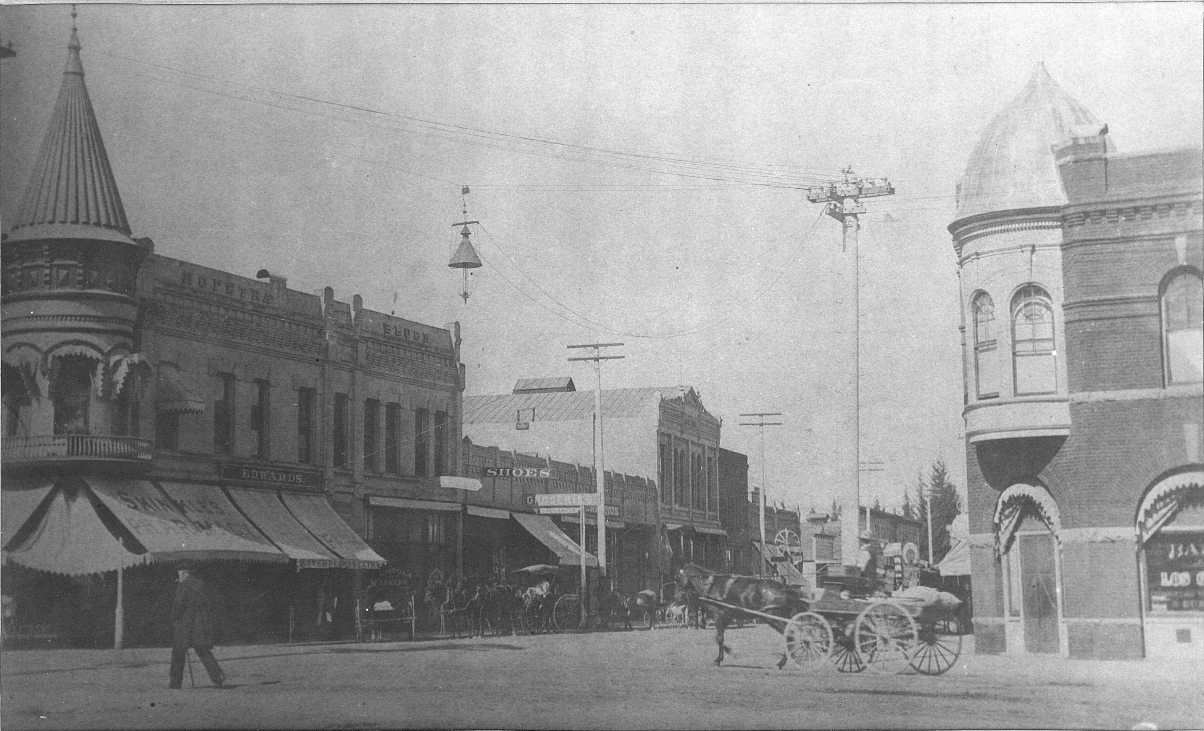 This is an early view of "The Elbow," the intersection of Santa Cruz Avenue and West Main Street. To the left is the La Canada building (originally the Hofstra Block). At right is the Theresa Block, built in 1890 by John Lyndon and named after his first wife, who died in 1889. For many years the Theresa Block housed the Bank of Los Gatos. HC092Collection