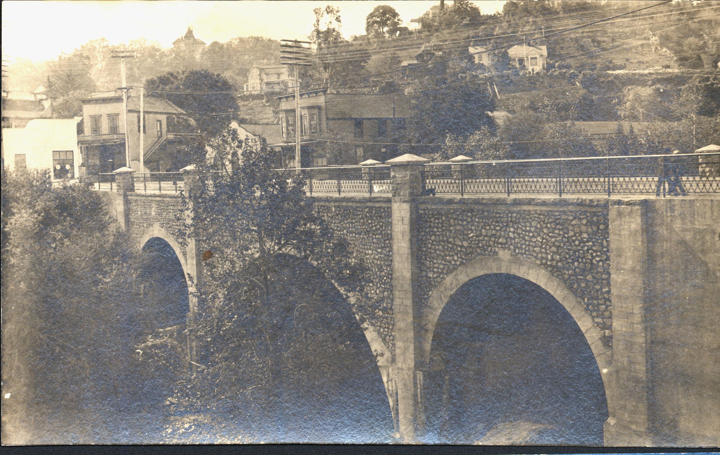 A southeasterly view of the Main Street Bridge which spanned Los Gatos Creek from 1906 - 1954. A path was worn from University Avenue School under the western arch of the bridge to Memorial Park. BRG012Subject