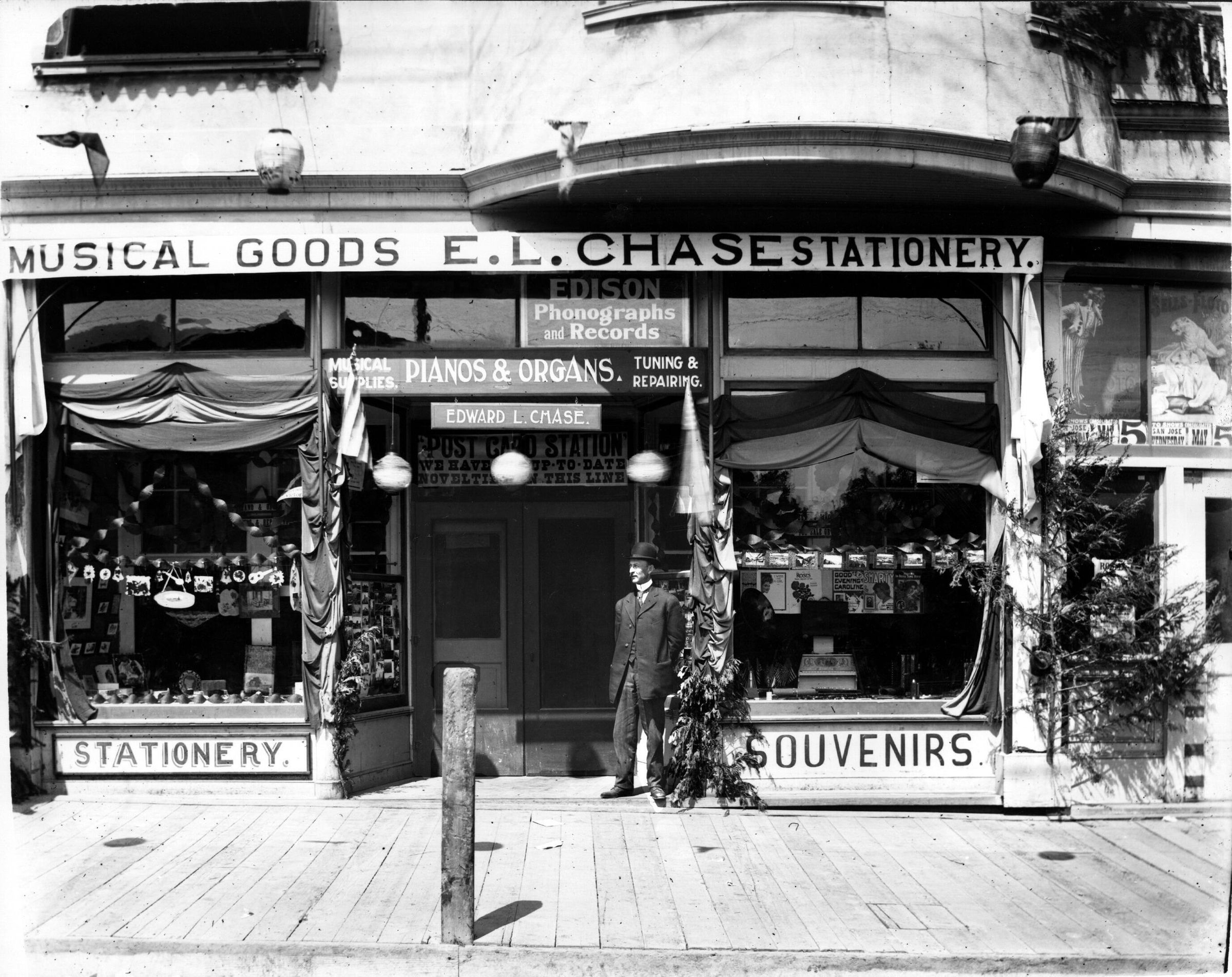 E.L. Chase's Stationery and Music store was located on West Main Street "on the bridge" in the Montezuma block. In addition to his post cards and writing utensils, he advertises "Edison Phonographs and Records," and "Pianos & Organs Tuned and Repaired." In the display window can be seen sheet music for two Albert Von Tilzer songs, "Good Evening, Caroline," and "Smarty." These songs were published in 1908, the same year Von Tilzer wrote, "Take Me Out to the Ball Game." BDG032Collection