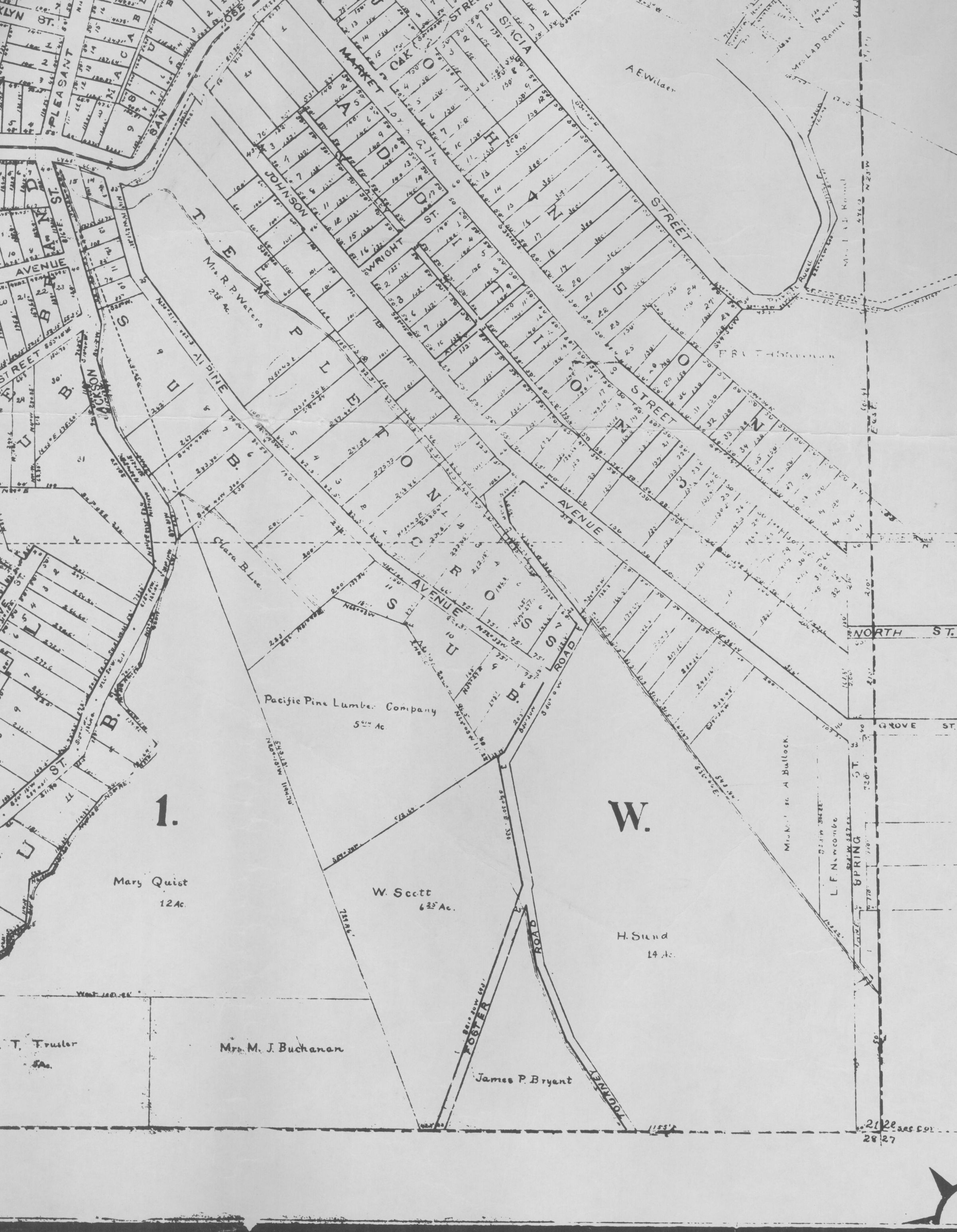 "From official records, deeds, private maps, and surveys, by F. G. Harriman, June 1, 1908." Streets right of section b. Streets included on this section: Jackson, Alpine, Johnson, Market (Loma Alta, Wright St. (Cross Way) and Stacia Street. MPS015cCollection