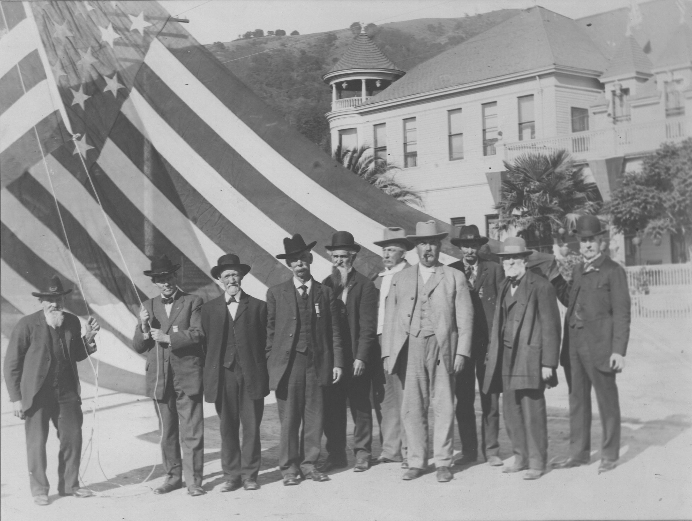 The flag raising ceremony in front of the Hotel Lyndon was performed by members of the Grand Army of the Republic and Woman's Relief Corps. Shown in the photograph are members of E.O.C. Ord Post No. 82. According to the Los Gatos Mail, "the May day crowd has been estimated by good judges of crowds at figures all the way from 15,000 to 30,000." HC039Collection