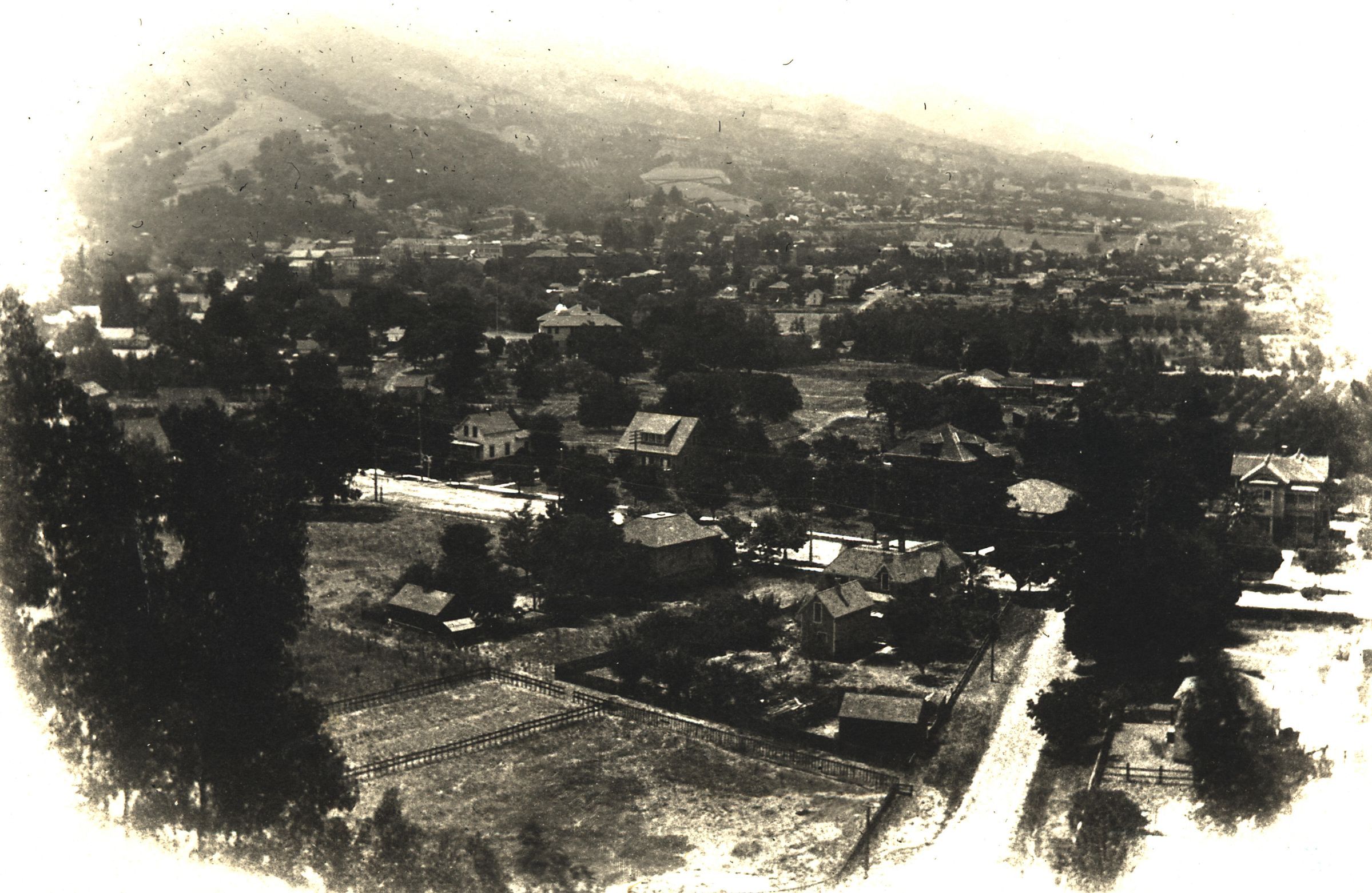 View is toward the southwest looking down Stacia Street in the lower right quadrant. San Jose Road (Los Gatos Boulevard) is the large road at the center. Los Gatos High School is visible to the left and above center. BER057Collection
