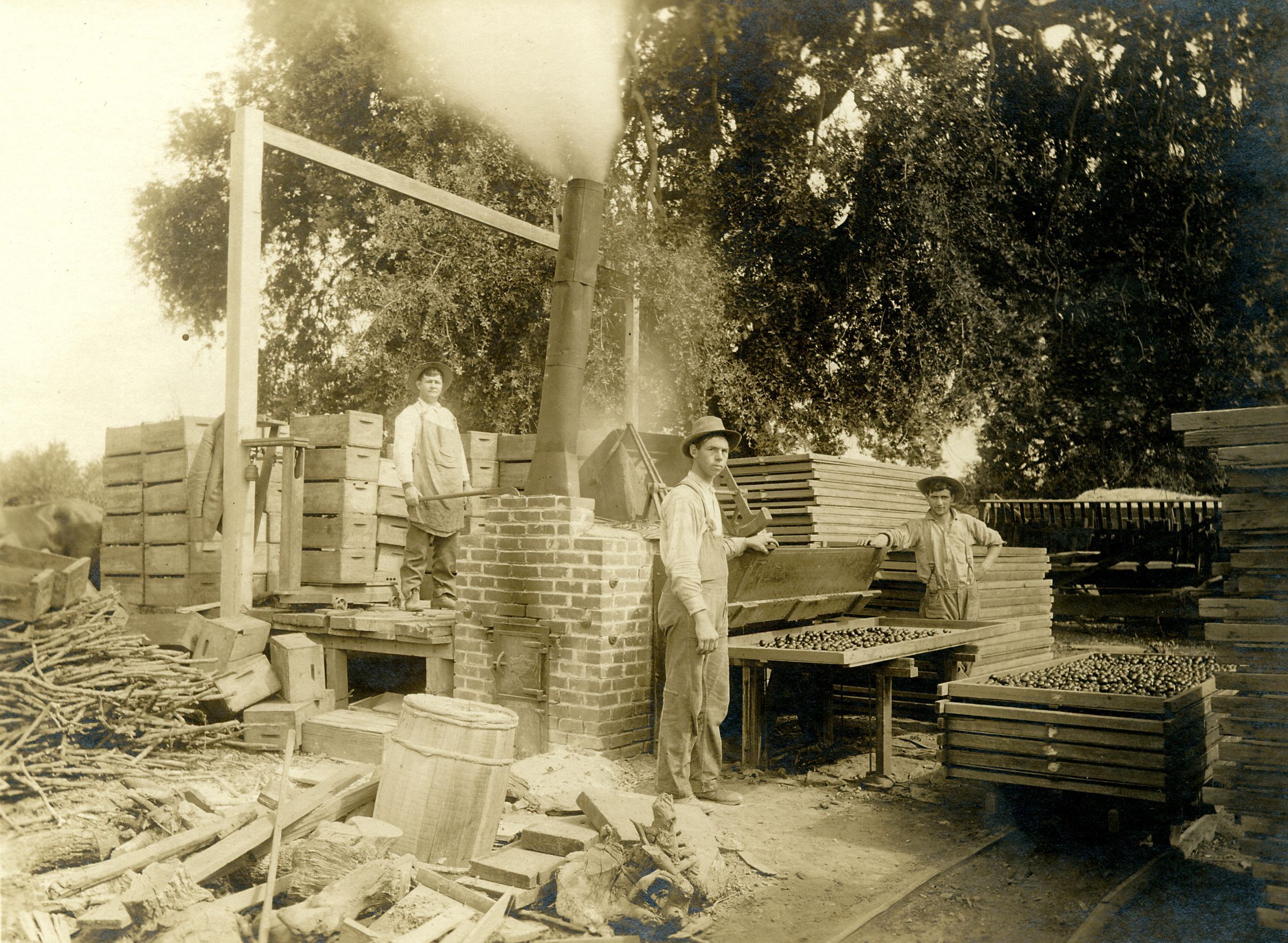 The photograph shows the "prune dipper" on the Rawlings ranch, located "in the country, half way between Los Gatos and San Jose." Prunes were dipped in scalding water and lye to tenderize the skins. The ranch was located near the present site of Pearl Avenue, and owned by George Snodgrass Rawlings (1843 - 1934). John A. Rawlings (b. 1876) is pictured at center. BER023Collection