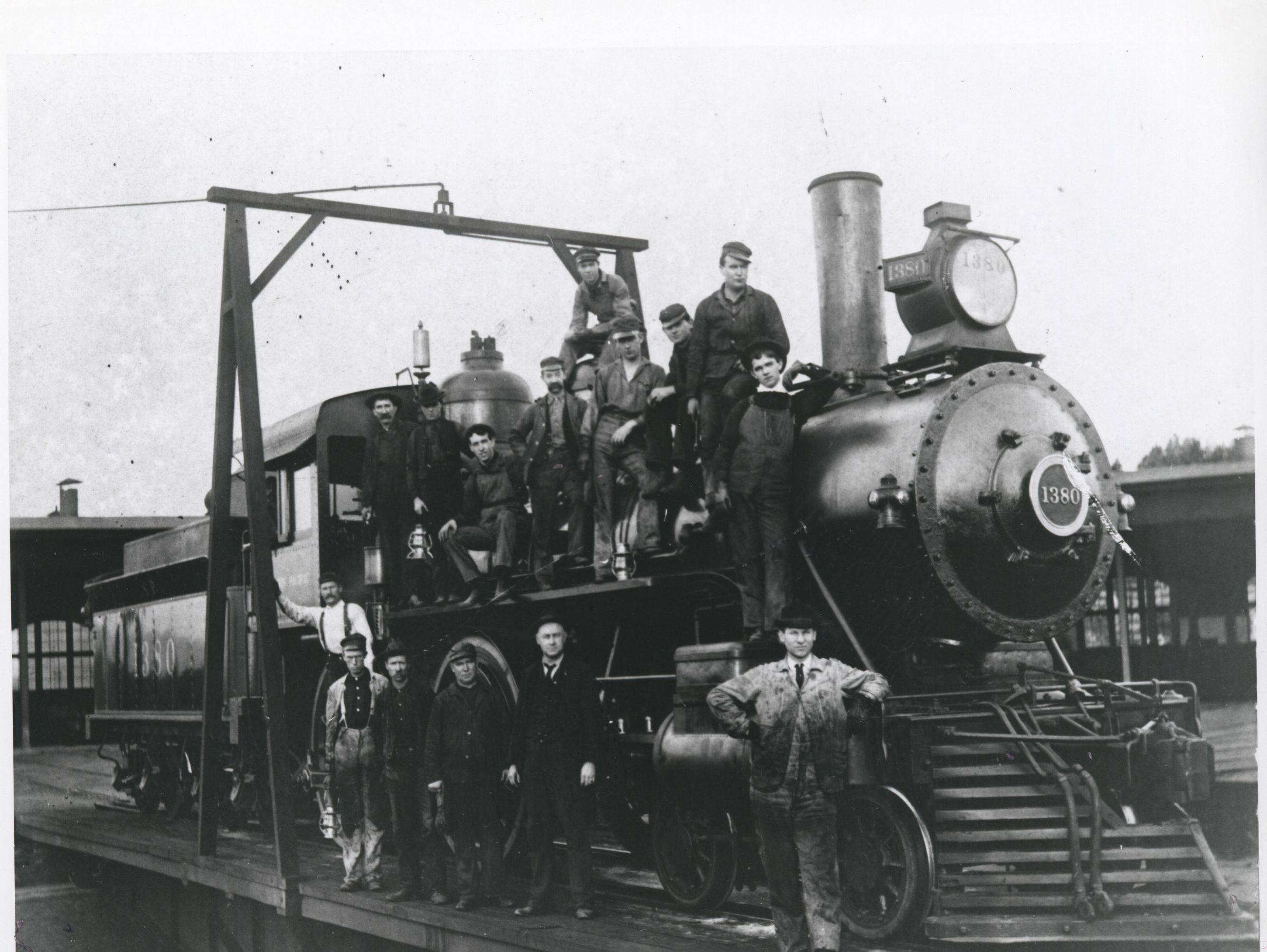 San Jose Roundhouse crews pose with Engine 1380 on the turntable. Against the pilot, at bottom right, is Billy Jones. TRAN006Collection