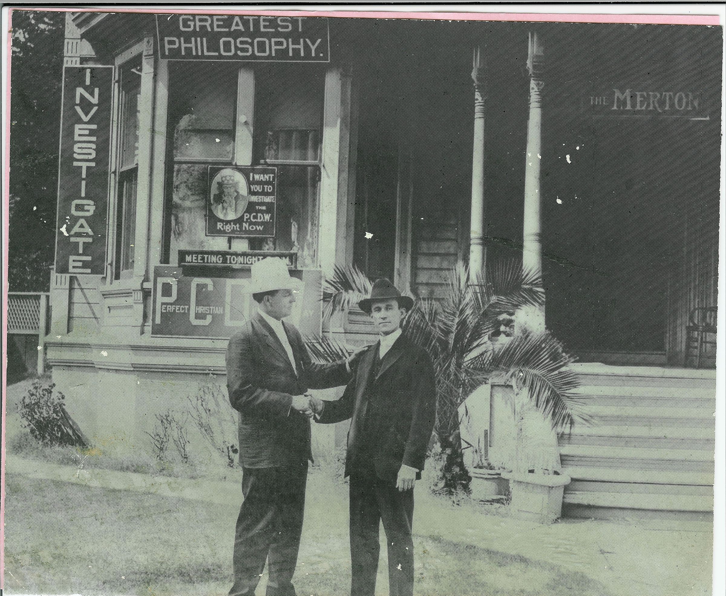 Father Riker, founder of Holy City, and Irvin Fisher, in front of their offices for the Perfect Christian Divine Way in Los Angeles. MTN087Collection