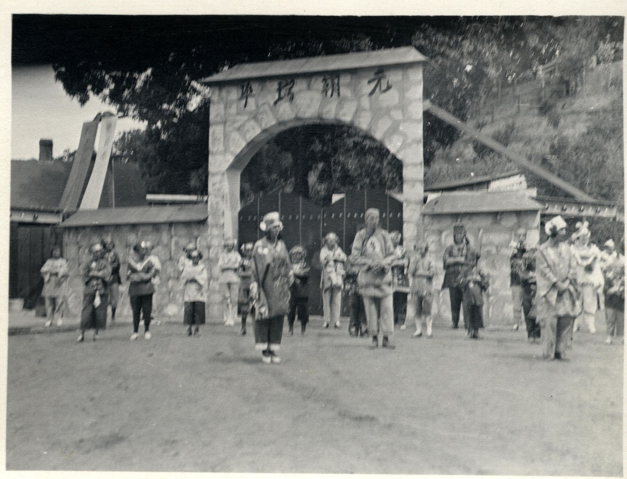 Cast assembled in front of arch on the set of Keang Foo, the Exile. Notice the terraced hillside behind the arch. It was part of the stage and added to the drama of the scenes of the pageant. PAG022Collection