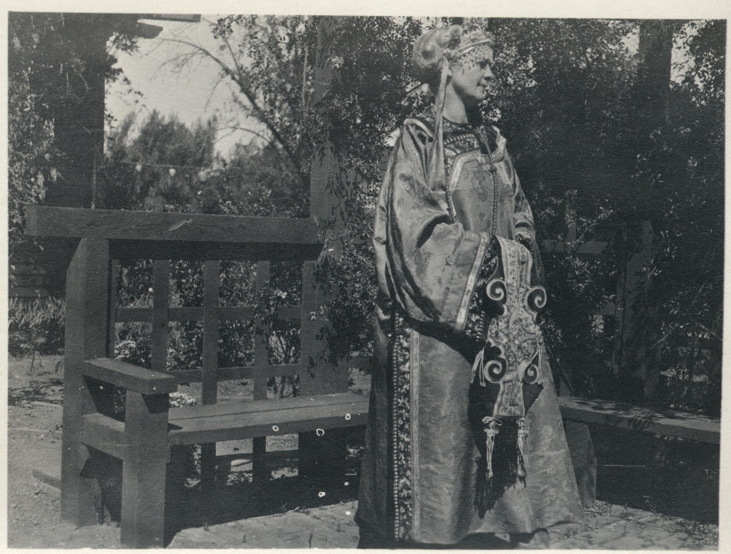 Lucy Balch in one of the elaborate costumes of the 1921 pageant. The story was adapted from a classic Chinese tale by Los Gatos playwright Wilbur Hall, and presented on June 24-25 that summer. Henry Crall played the role of Keang Foo, the prince who saves his country from ruin. The town held an election to pick the Los Gatos High School girl who would play Princess Moy Po, and Miss Frances Yount won, gathering over a thousand votes. PAG025Collection