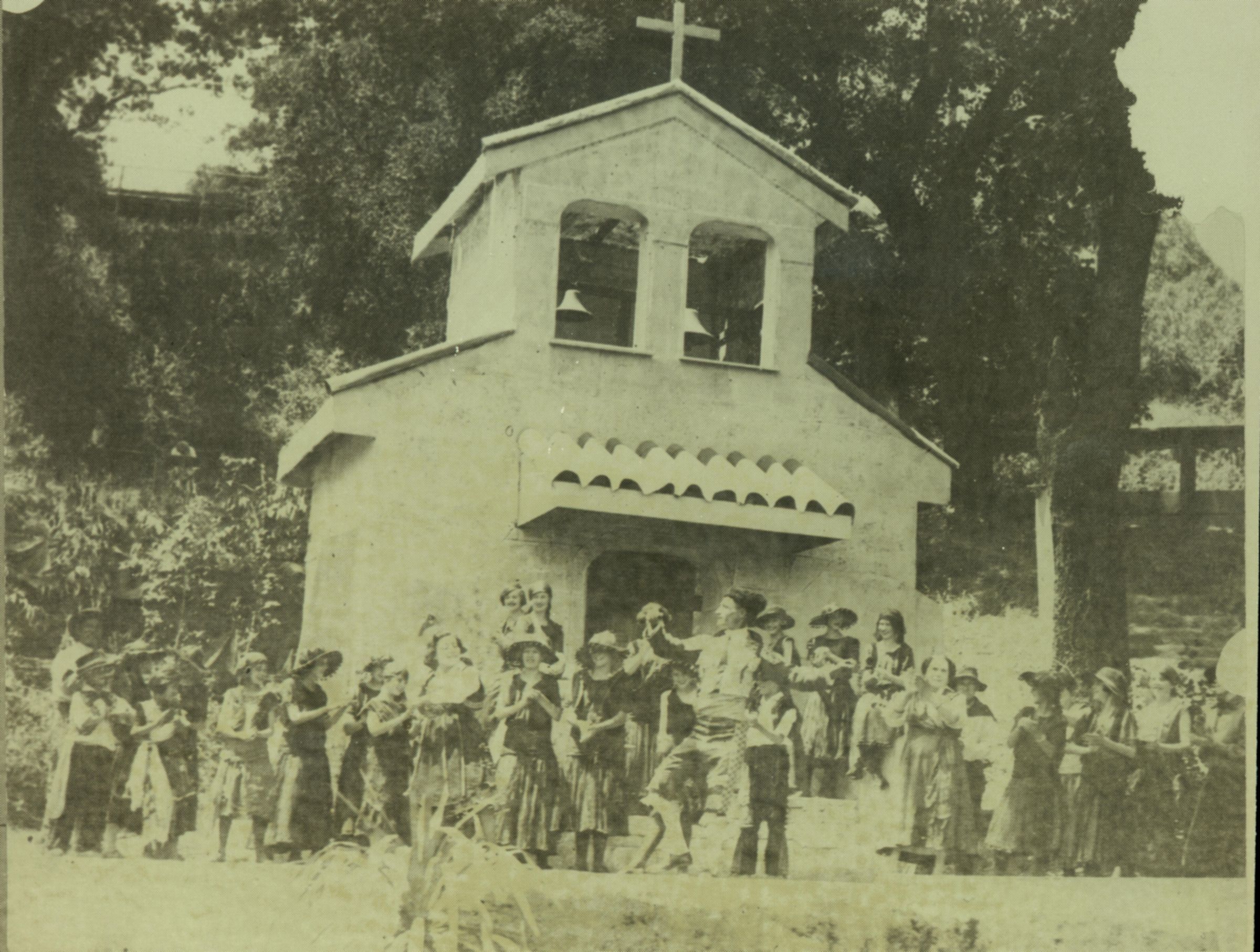 The cast of El Gato de Los Gatos in front of the stage mission. PAG040Collection