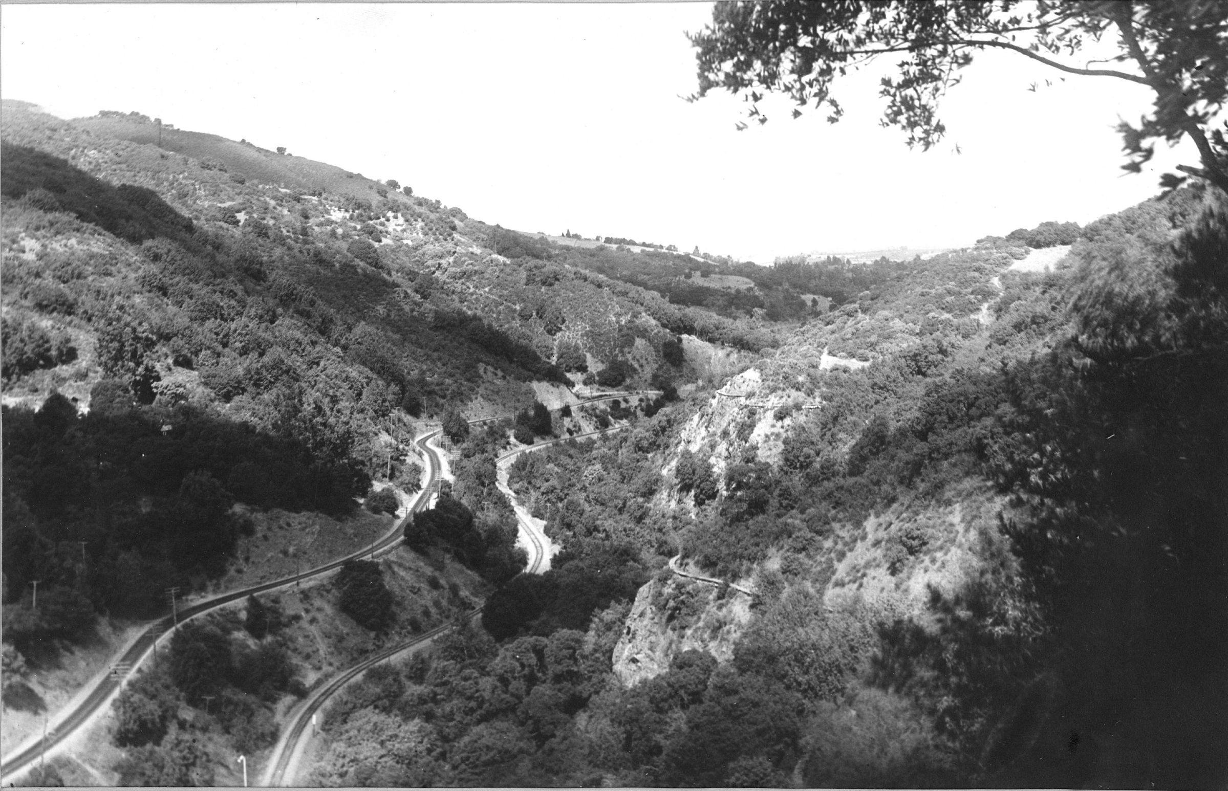 This view looks north toward Los Gatos from the canyon to the south in August 1924. To the left is the two lane concrete highway that was completed in 1921. A portion of the flume that brought water to Los Gatos can be seen on the right. The railroad tracks are seen at center. HC097Collection