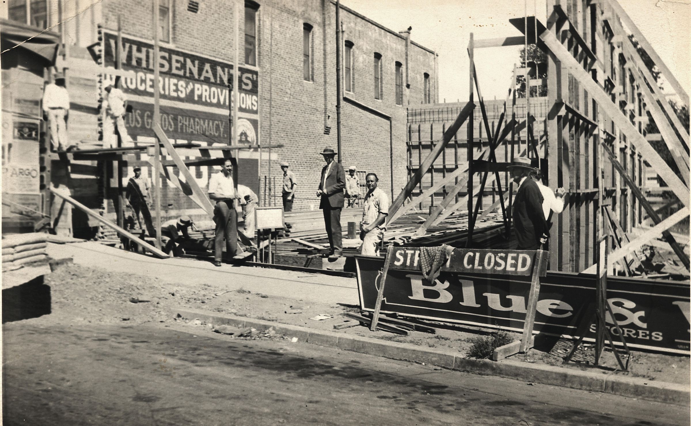 William John Whisenant (1897 - 1971) stands at the center of this circa 1929 photograph, smoking a cigar and surveying his latest project, a building at 49 East Main Street. When Whisenant arrived in Los Gatos in the 1920s, he purchased the 1890s building at left to house a pharmacy, grocery store, and soda fountain. BER052Collection
