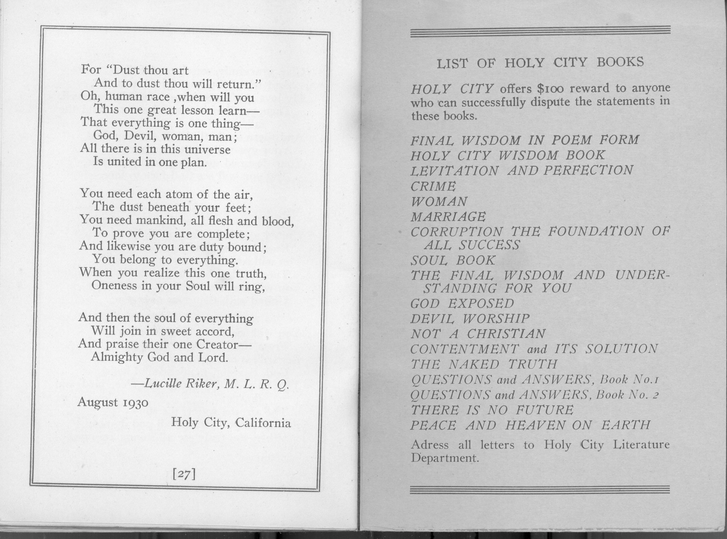 Entitled "World's Greatest Final Wisdom In Poem Form," by Lucille Riker. BER190oCollection